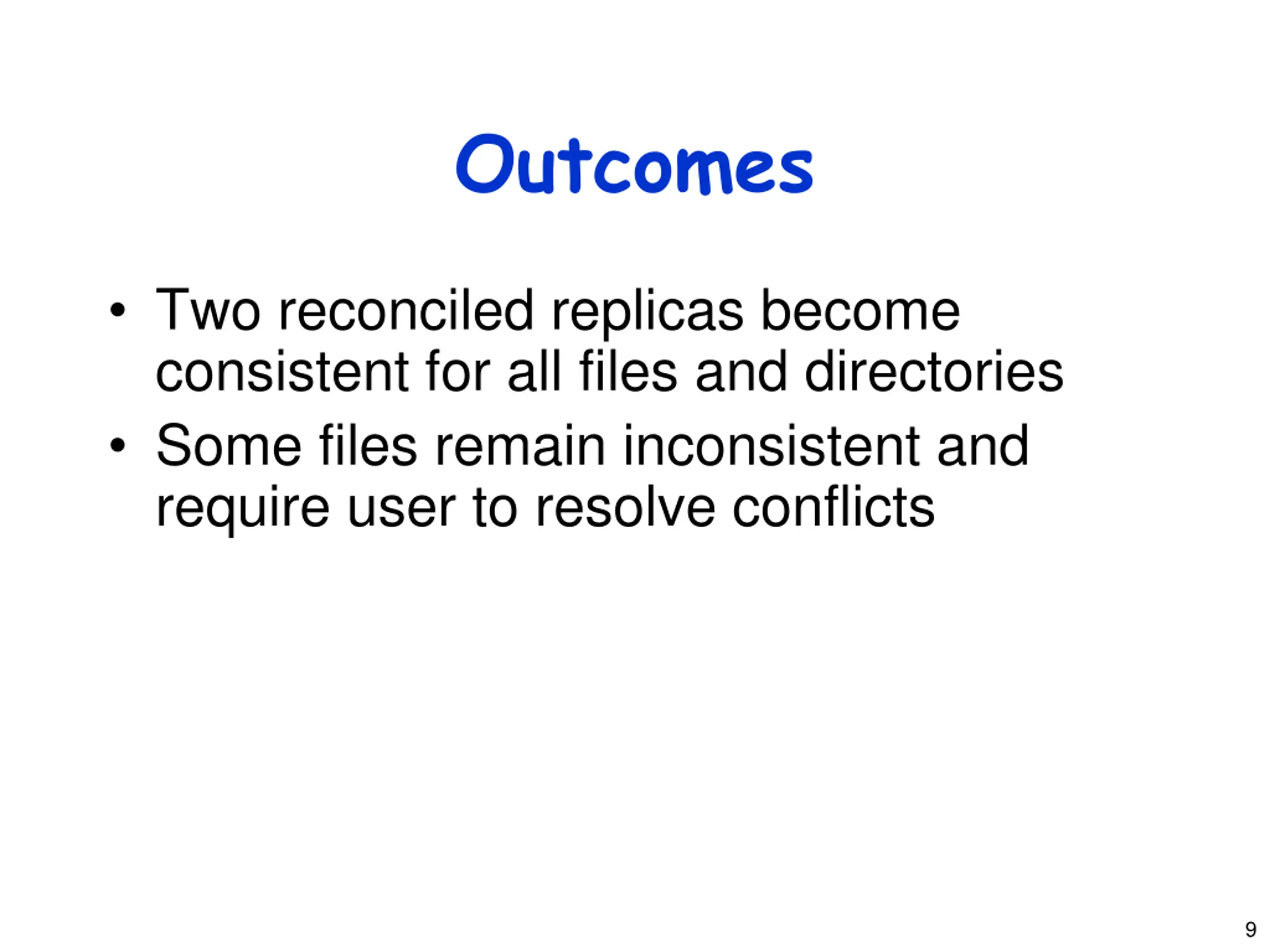 Outcomes Two reconciled replicas become consistent for all files and directories Some files remain inconsistent and require user to resolve conflicts 9