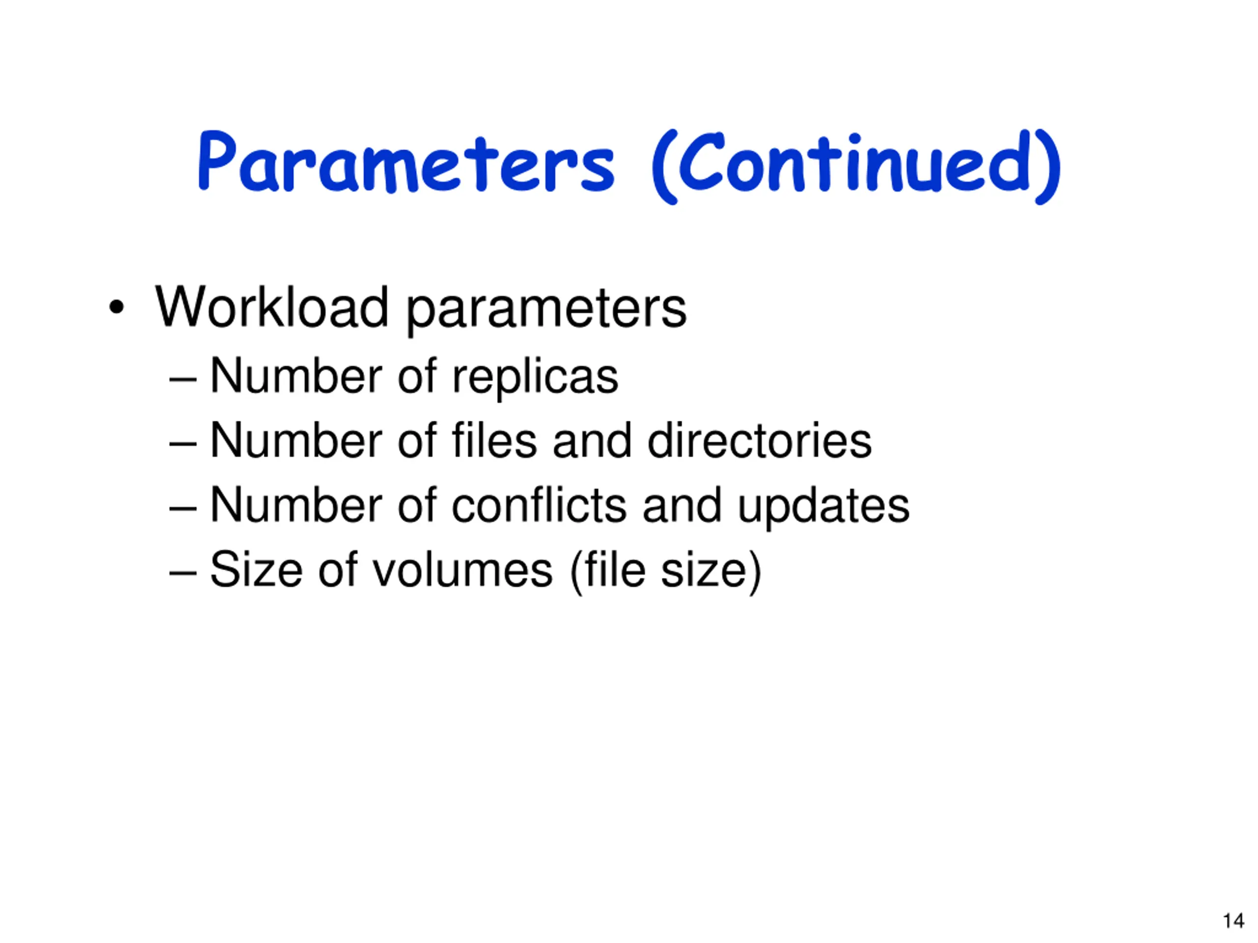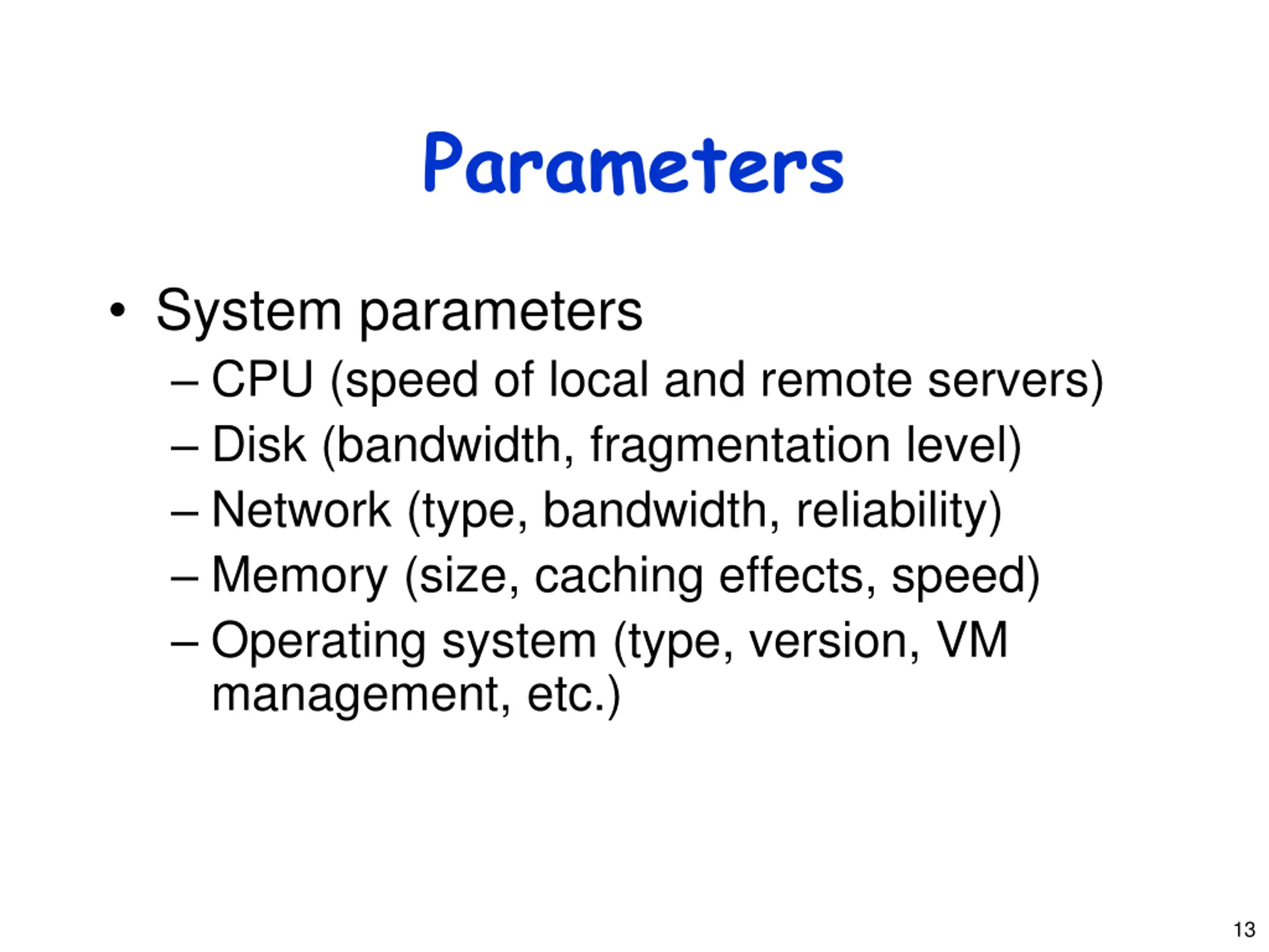 Parameters System parameters CPU (speed of local and remote servers) Disk (bandwidth, fragmentation level) Network (type, bandwidth, reliability) Memory (size, caching effects, speed) Operating system (type, version, VM management, etc.) 13
