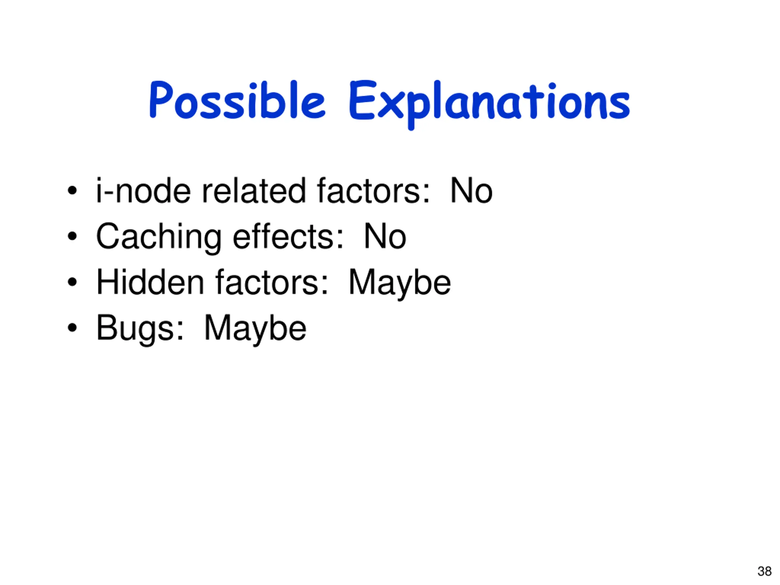 Possible Explanations i-node related factors: No Caching effects: No Hidden factors: Maybe Bugs: Maybe 38