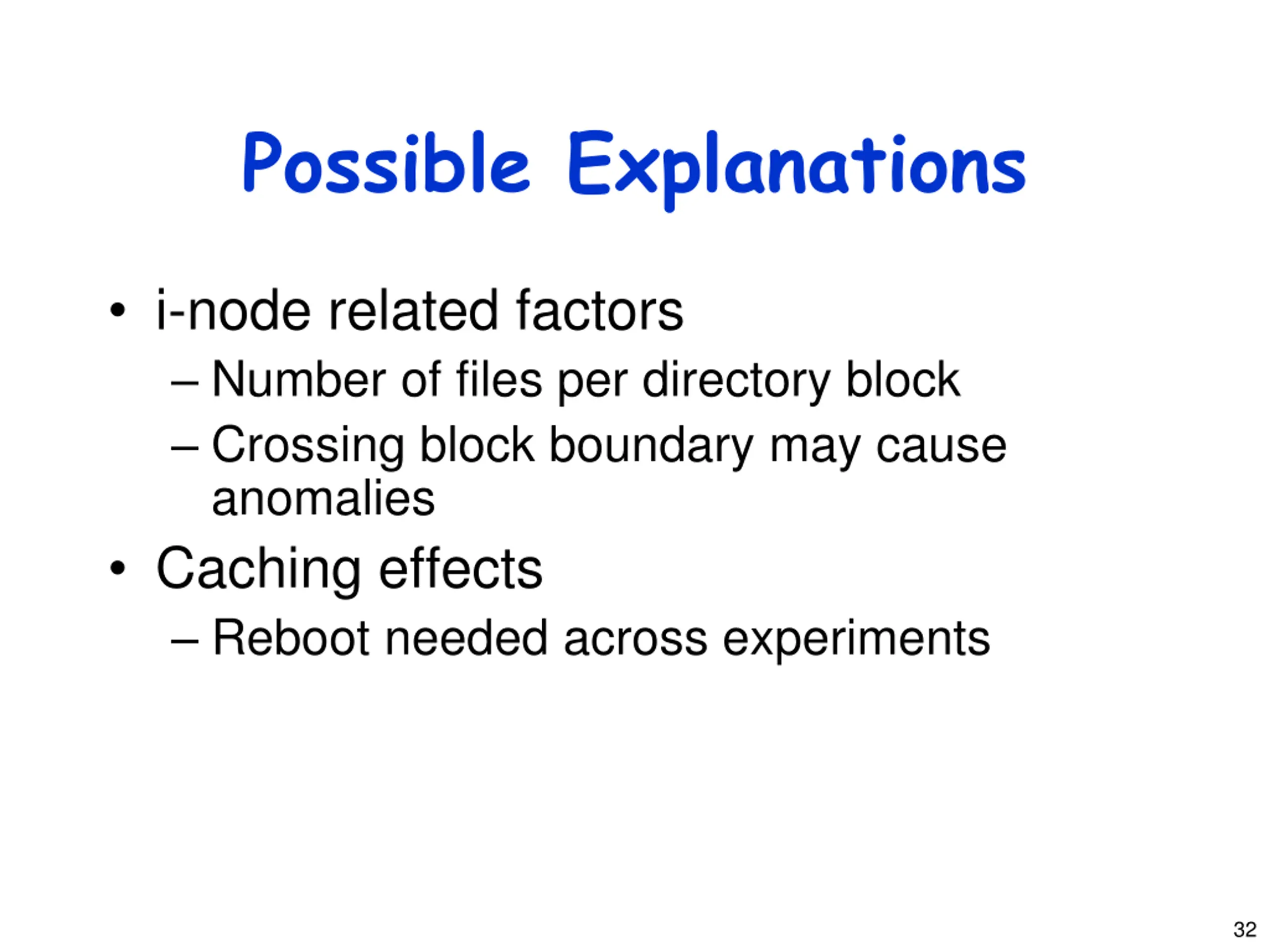 Possible Explanations i-node related factors Number of files per directory block Crossing block boundary may cause anomalies Caching effects Reboot needed across experiments 32