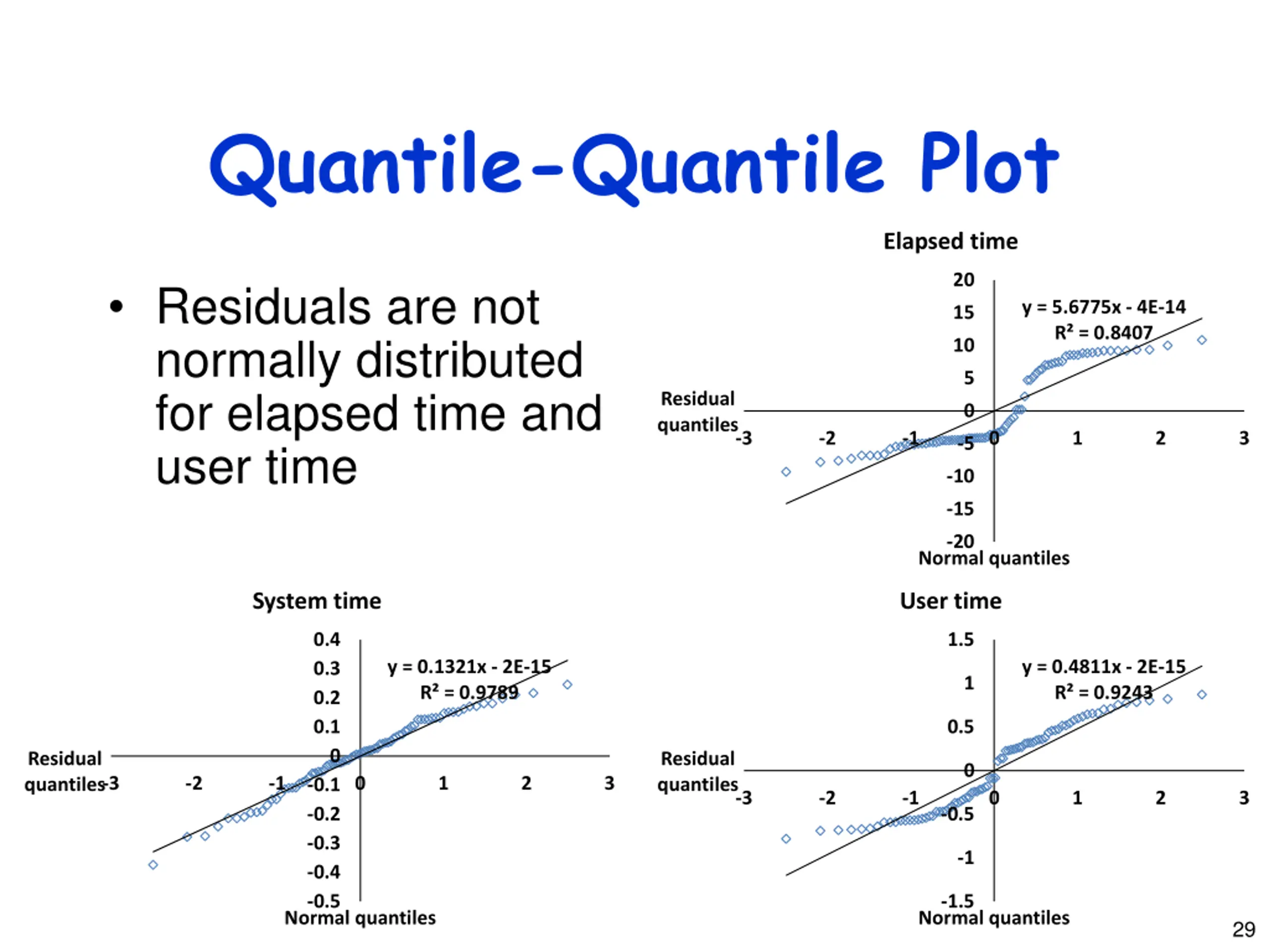 Quantile-Quantile Plot Elapsed time 20 Residuals are not normally distributed for elapsed time and user time y = 5.6775x - 4E-14 R = 0.8407 15 10 5 Residual quantiles 0 -3 -2 -1 0 1 2 3 -5 -10 -15 -20 Normal quantiles System time User time 0.4 1.5 y = 0.1321x - 2E-15 R = 0.9789 y = 0.4811x - 2E-15 R = 0.9243 0.3 1 0.2 0.1 0.5 0 Residual quantiles Residual quantiles 0 -3 -2 -1 0 1 2 3 -0.1 -3 -2 -1 0 1 2 3 -0.2 -0.5 -0.3 -1 -0.4 -0.5 -1.5 Normal quantiles Normal quantiles 29