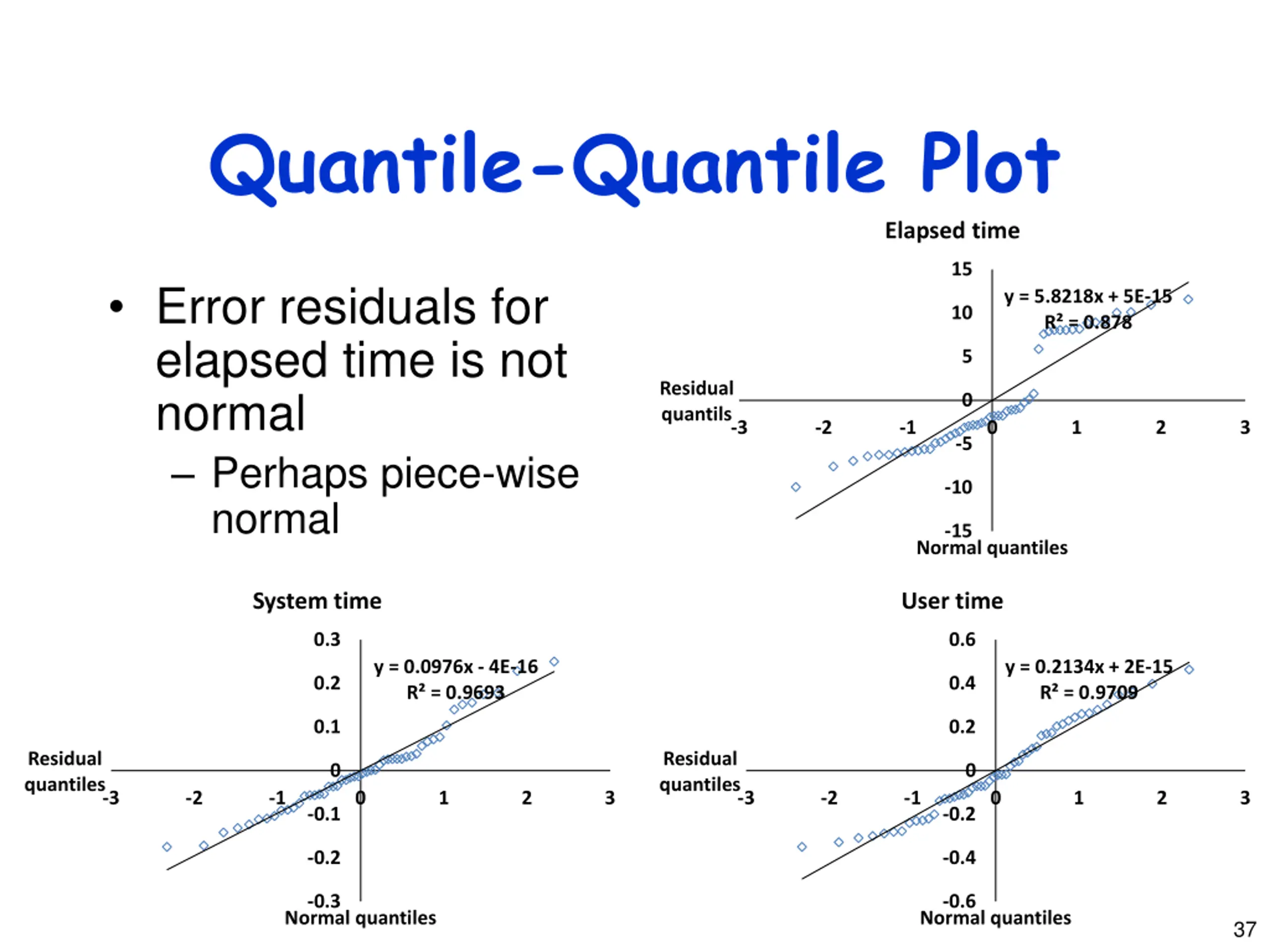 Quantile-Quantile Plot Elapsed time 15 Error residuals for elapsed time is not normal Perhaps piece-wise normal y = 5.8218x + 5E-15 R = 0.878 10 5 Residual quantils 0 -3 -2 -1 0 1 2 3 -5 -10 -15 Normal quantiles System time User time 0.3 0.6 y = 0.0976x - 4E-16 R = 0.9693 y = 0.2134x + 2E-15 R = 0.9709 0.2 0.4 0.1 0.2 Residual quantiles Residual quantiles 0 0 -3 -2 -1 0 1 2 3 -3 -2 -1 0 1 2 3 -0.1 -0.2 -0.2 -0.4 -0.3 -0.6 Normal quantiles Normal quantiles 37