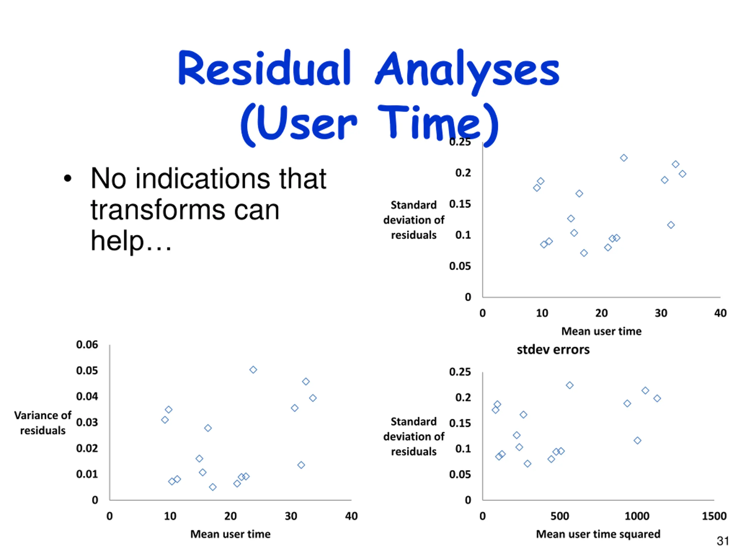 Residual Analyses (User Time) No indications that transforms can help 0.25 0.2 0.15 Standard deviation of residuals 0.1 0.05 0 0 10 20 30 40 Mean user time 0.06 stdev errors 0.05 0.25 0.04 0.2 Variance of residuals Standard deviation of residuals 0.03 0.15 0.02 0.1 0.01 0.05 0 0 0 10 20 30 40 0 500 1000 1500 Mean user time Mean user time squared 31