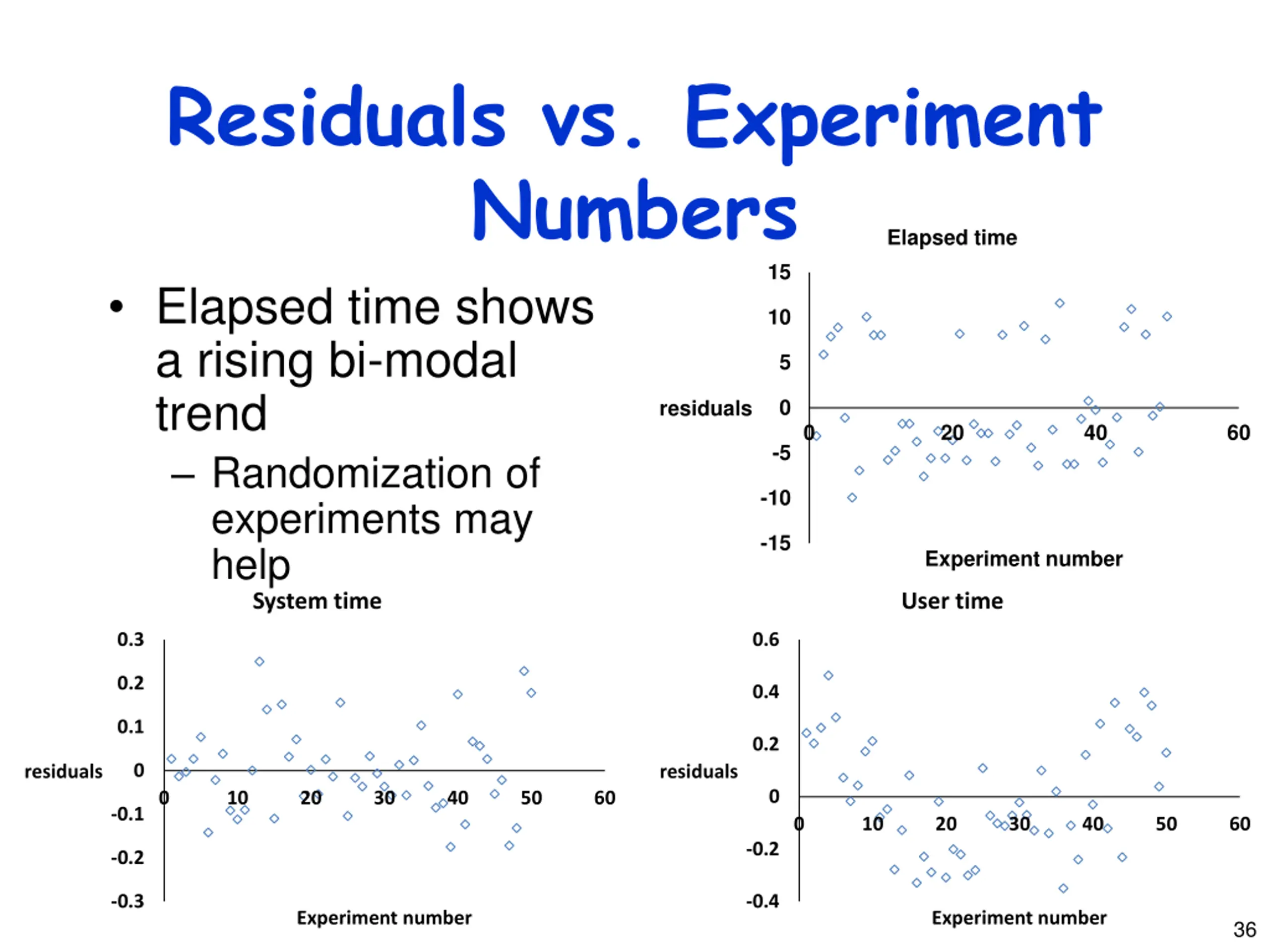 Residuals vs. Experiment Numbers Elapsed time shows a rising bi-modal trend Randomization of experiments may help System time Elapsed time 15 10 5 0 residuals 0 20 40 60 -5 -10 -15 Experiment number User time 0.3 0.6 0.2 0.4 0.1 0.2 0 residuals residuals 0 0 10 20 30 40 50 60 -0.1 0 10 20 30 40 50 60 -0.2 -0.2 -0.3 -0.4 Experiment number Experiment number 36