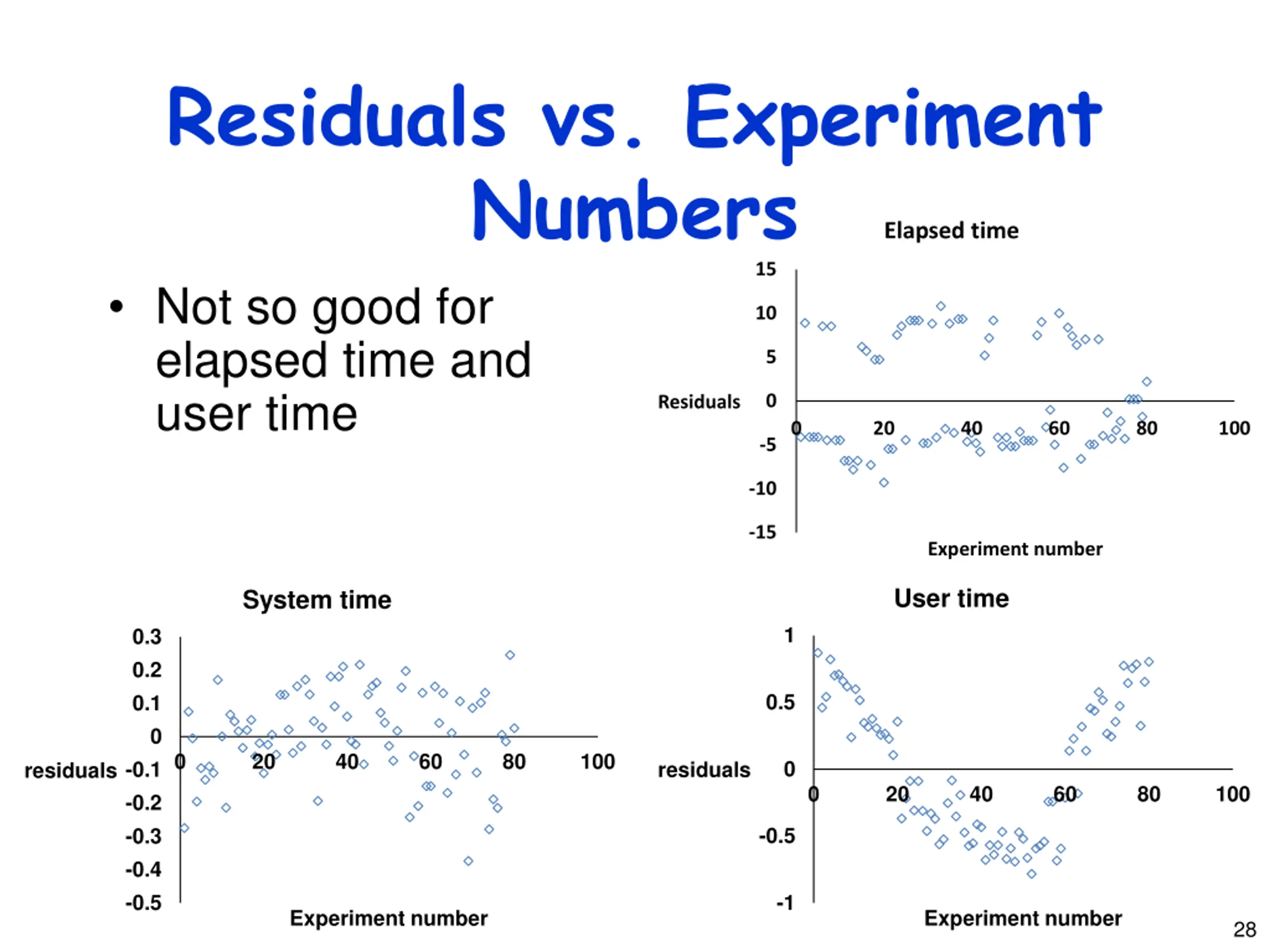 Residuals vs. Experiment Numbers Not so good for elapsed time and user time Elapsed time 15 10 5 0 Residuals 0 20 40 60 80 100 -5 -10 -15 Experiment number User time System time 1 0.3 0.2 0.5 0.1 0 0 20 40 60 80 100 0 -0.1 residuals residuals 0 20 40 60 80 100 -0.2 -0.5 -0.3 -0.4 -0.5 -1 Experiment number Experiment number 28