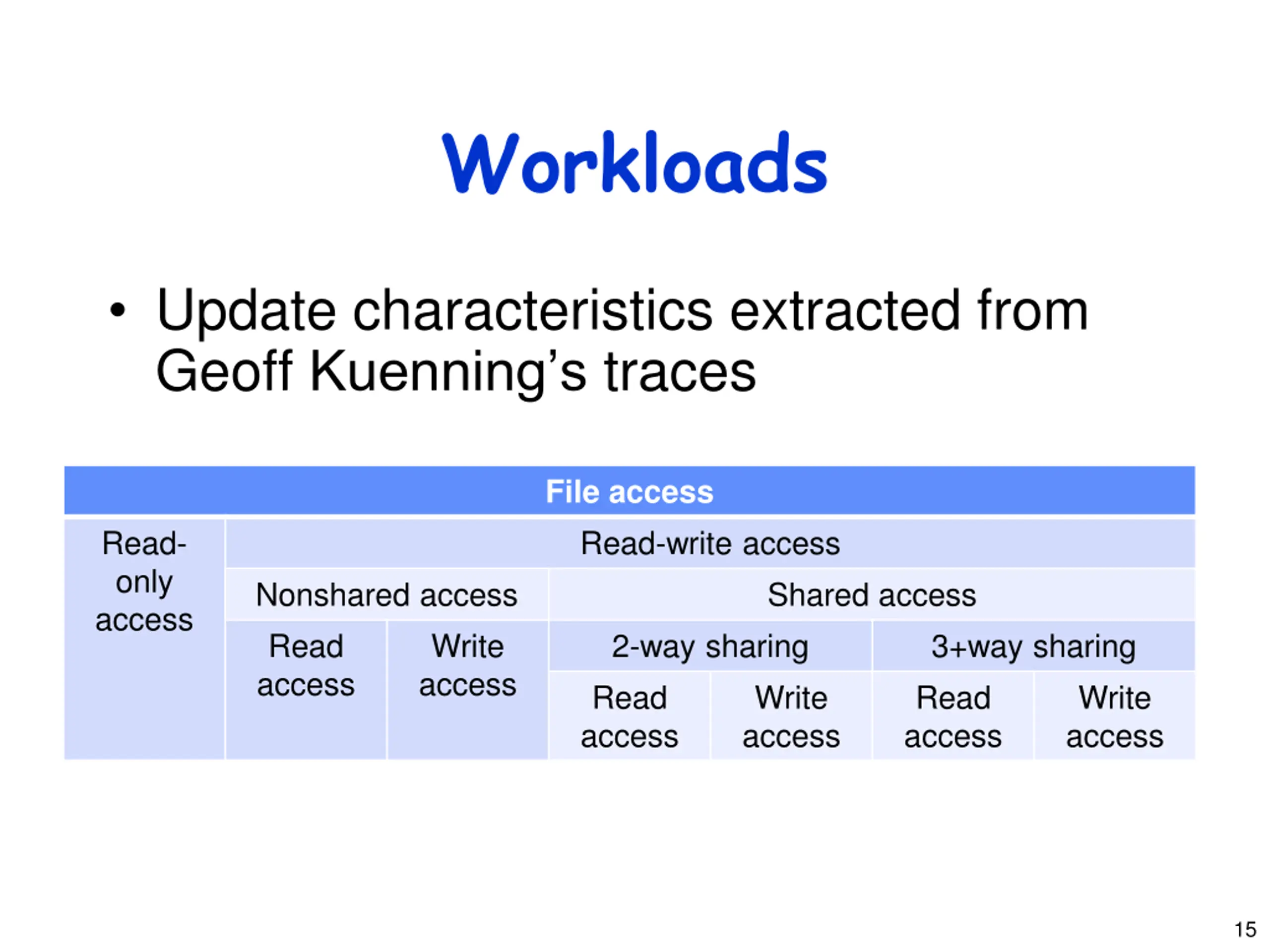 Workloads Update characteristics extracted from Geoff Kuenning s traces File access Read-write access Read- only access Nonshared access Read access Shared access Write access 2-way sharing Read access 3+way sharing Read access Write access Write access 15