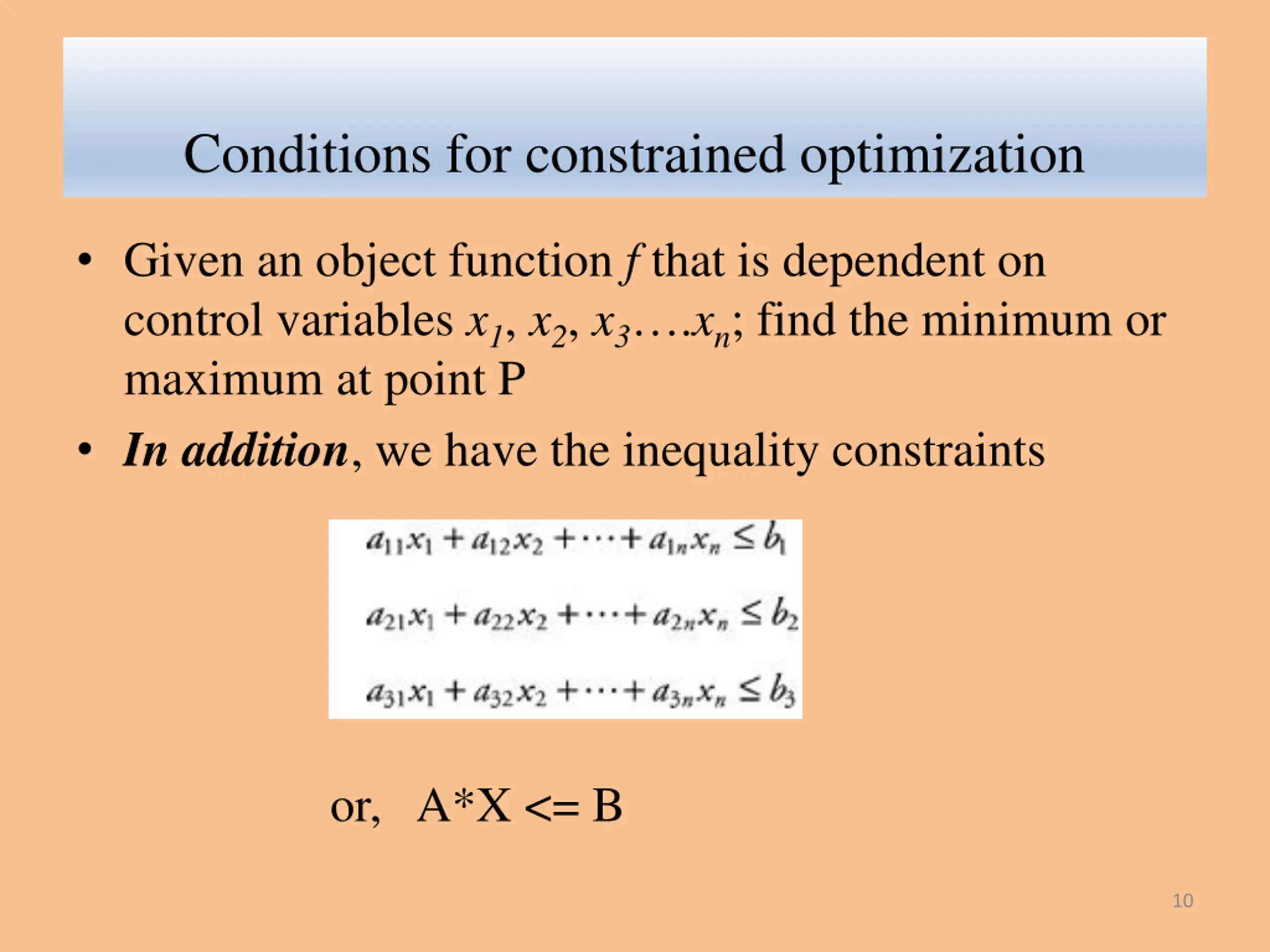 Conditions for constrained optimization Given an object function f that is dependent on control variables x1, x2, x3 .xn; find the minimum or maximum at point P In addition, we have the inequality constraints or, A*X <= B 10