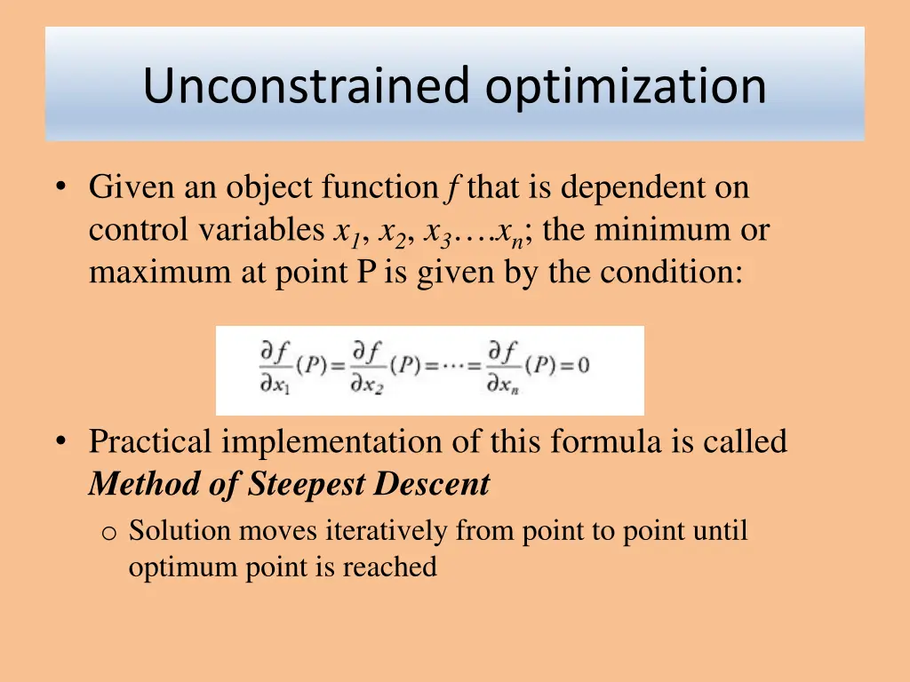 Unconstrained optimization Given an object function f that is dependent on control variables x1, x2, x3 .xn; the minimum or maximum at point P is given by the condition: Practical implementation of this formula is called Method of Steepest Descent o Solution moves iteratively from point to point until optimum point is reached