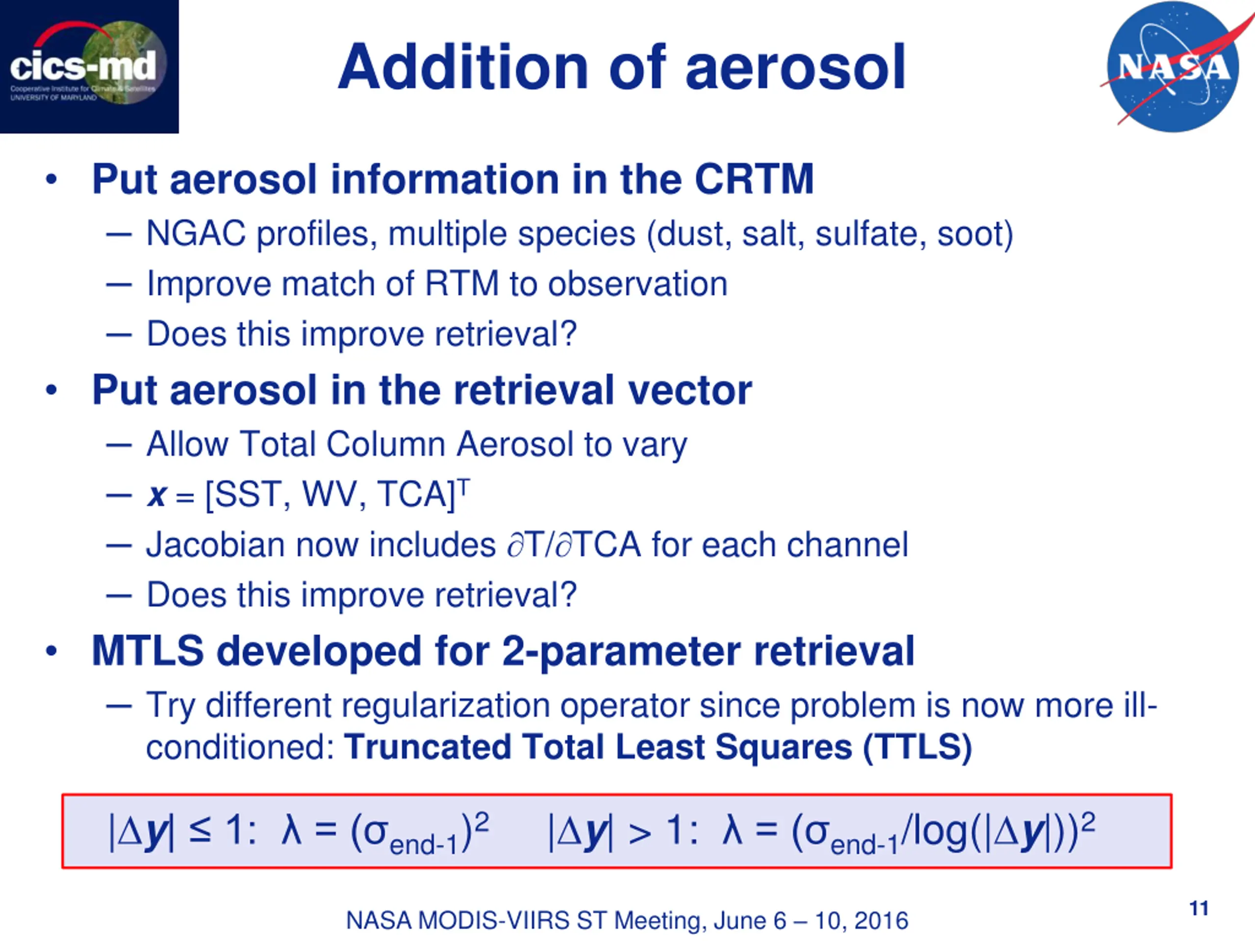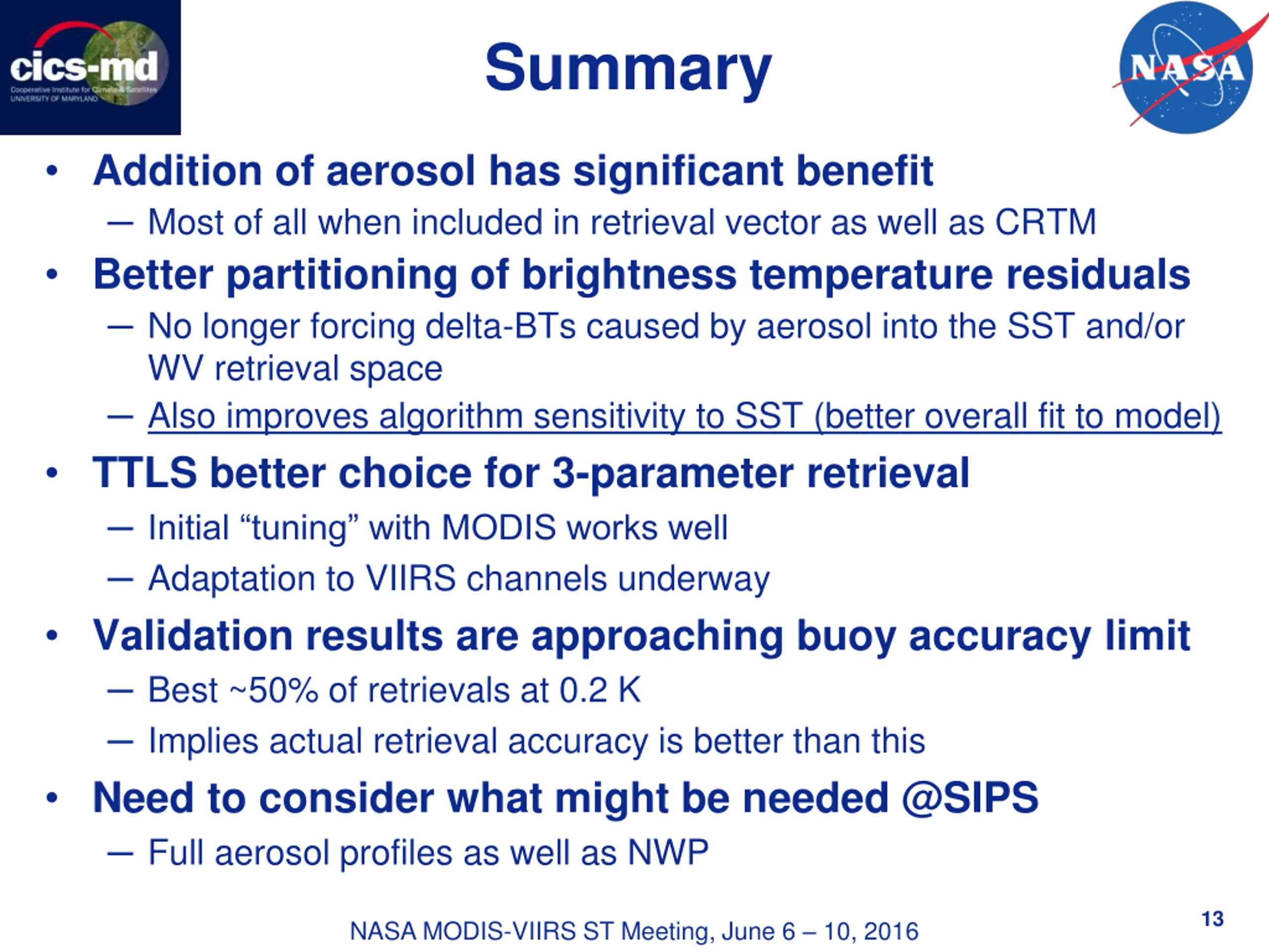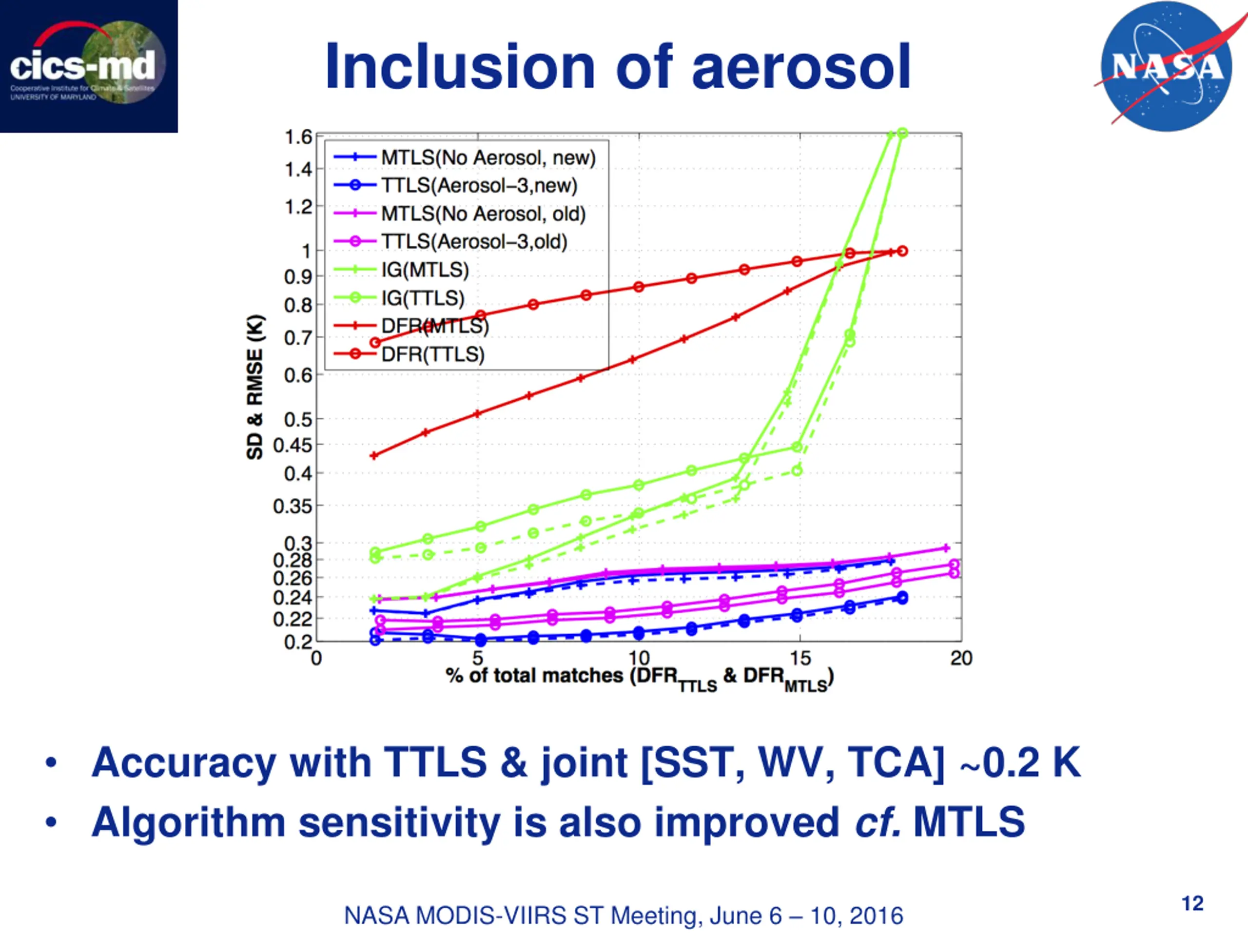 Inclusion of aerosol Accuracy with TTLS & joint [SST, WV, TCA] ~0.2 K Algorithm sensitivity is also improved cf. MTLS 12 NASA MODIS-VIIRS ST Meeting, June 6 10, 2016