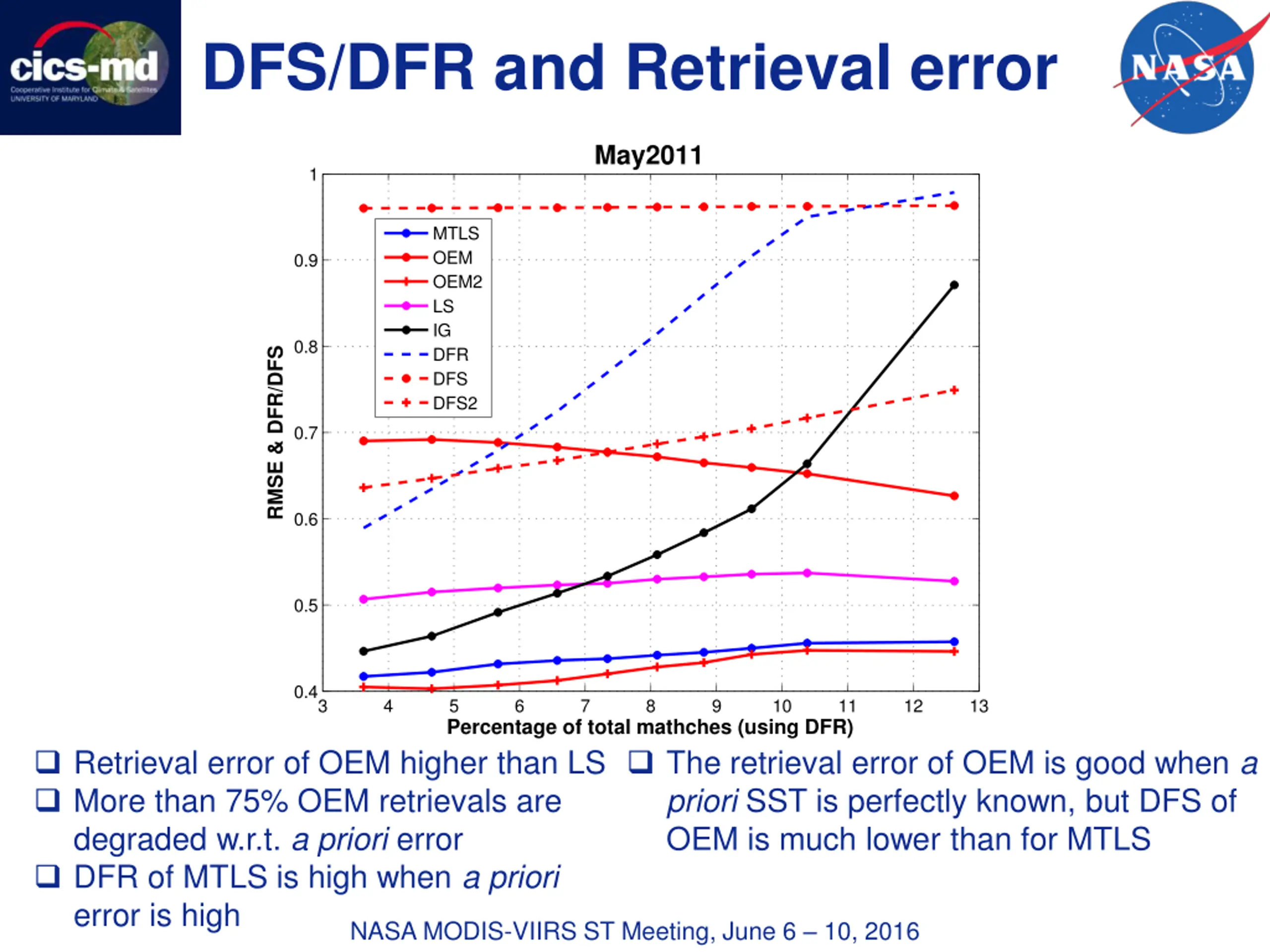 DFS/DFR and Retrieval error May2011 1 MTLS OEM OEM2 LS IG DFR DFS DFS2 0.9 0.8 RMSE & DFR/DFS 0.7 0.6 0.5 0.4 3 4 5 Percentage of total mathches (using DFR) 6 7 8 9 10 11 12 13 Retrieval error of OEM higher than LS More than 75% OEM retrievals are degraded w.r.t. a priori error DFR of MTLS is high when a priori error is high NASA MODIS-VIIRS ST Meeting, June 6 10, 2016