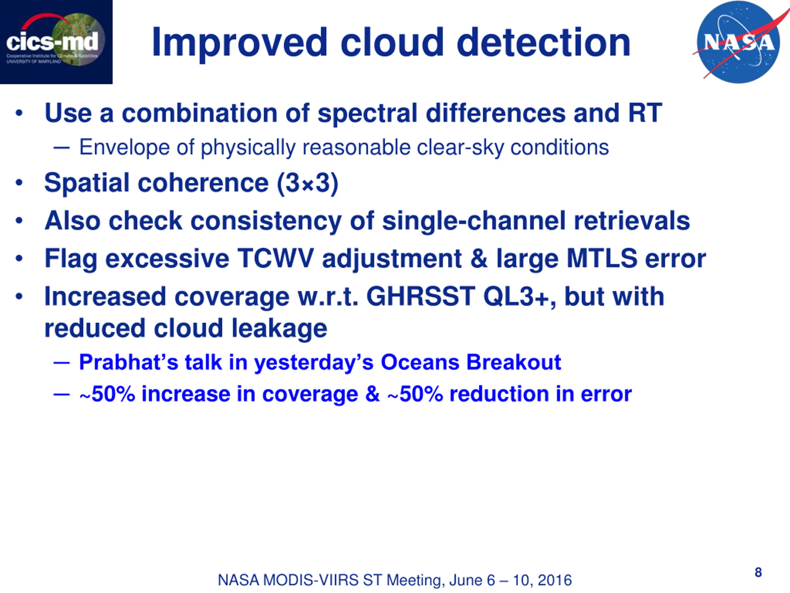 Improved cloud detection Use a combination of spectral differences and RT Envelope of physically reasonable clear-sky conditions Spatial coherence (3 3) Also check consistency of single-channel retrievals Flag excessive TCWV adjustment & large MTLS error Increased coverage w.r.t. GHRSST QL3+, but with reduced cloud leakage Prabhat stalk in yesterday s Oceans Breakout ~50% increase in coverage & ~50% reduction in error 8 NASA MODIS-VIIRS ST Meeting, June 6 10, 2016