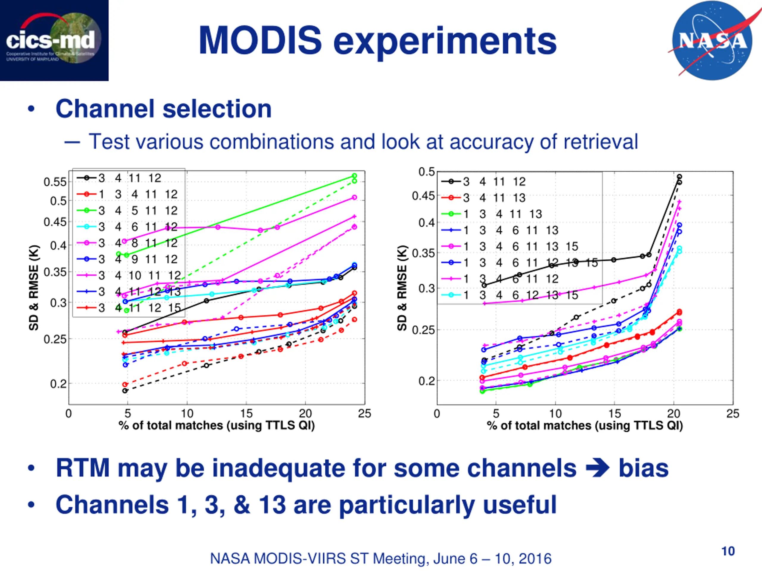 MODIS experiments Channel selection Test various combinations and look at accuracy of retrieval (a) (b) 0.5 3 4 11 12 1 3 4 11 12 3 4 5 11 12 3 4 6 11 12 3 4 8 11 12 3 4 9 11 12 3 4 10 11 12 3 4 11 12 13 3 4 11 12 15 3 4 11 12 3 4 11 13 1 3 4 11 13 1 3 4 6 11 13 1 3 4 6 11 13 15 1 3 4 6 11 12 13 15 1 3 4 6 11 12 1 3 4 6 12 13 15 0.55 0.45 0.5 0.45 0.4 0.4 SD & RMSE (K) SD & RMSE (K) 0.35 0.35 0.3 0.3 0.25 0.25 0.2 0.2 0 5 10 15 20 25 0 5 10 15 20 25 % of total matches (using TTLS QI) % of total matches (using TTLS QI) RTM may be inadequate for some channels Channels 1, 3, & 13 are particularly useful bias 10 NASA MODIS-VIIRS ST Meeting, June 6 10, 2016