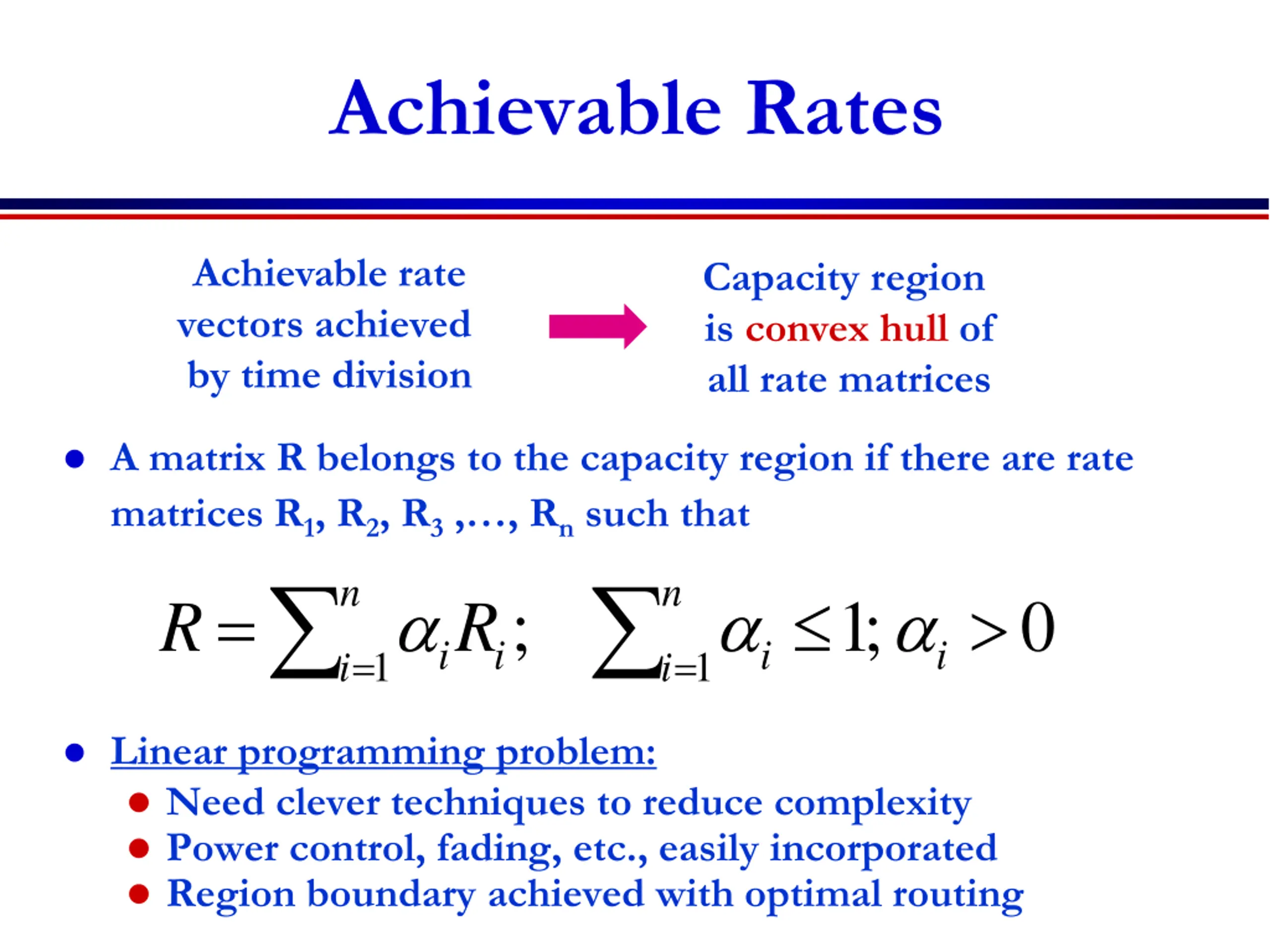 Achievable Rates Achievable rate vectors achieved by time division Capacity region is convex hull of all rate matrices A matrix R belongs to the capacity region if there are rate matrices R1, R2, R3, , Rn such that = = i i R n n ; ; 1 0 iR i i = 1 1 i Linear programming problem: Need clever techniques to reduce complexity Power control, fading, etc., easily incorporated Region boundary achieved with optimal routing