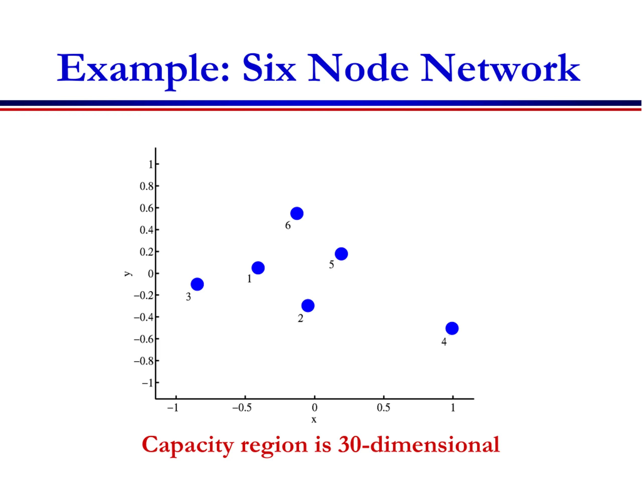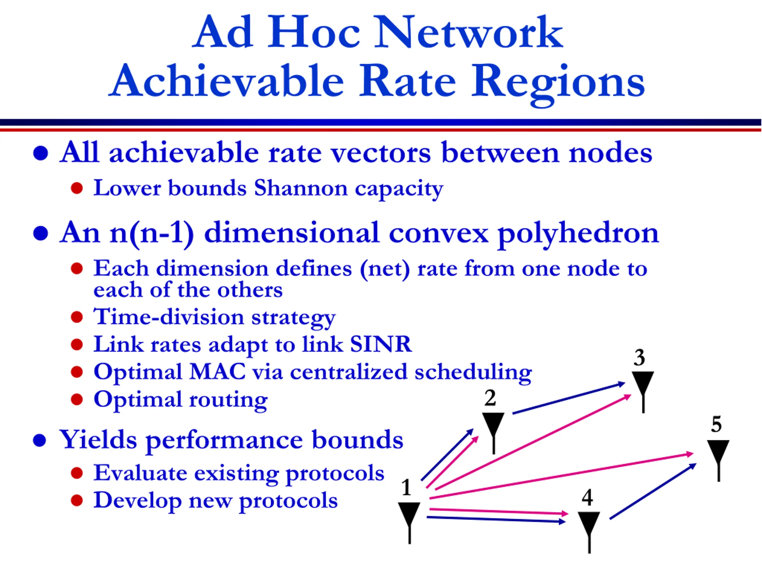 Ad Hoc Network Achievable Rate Regions All achievable rate vectors between nodes Lower bounds Shannon capacity An n(n-1) dimensional convex polyhedron Each dimension defines (net) rate from one node to each of the others Time-division strategy Link rates adapt to link SINR Optimal MAC via centralized scheduling Optimal routing Yields performance bounds Evaluate existing protocols Develop new protocols 3 2 5 1 4