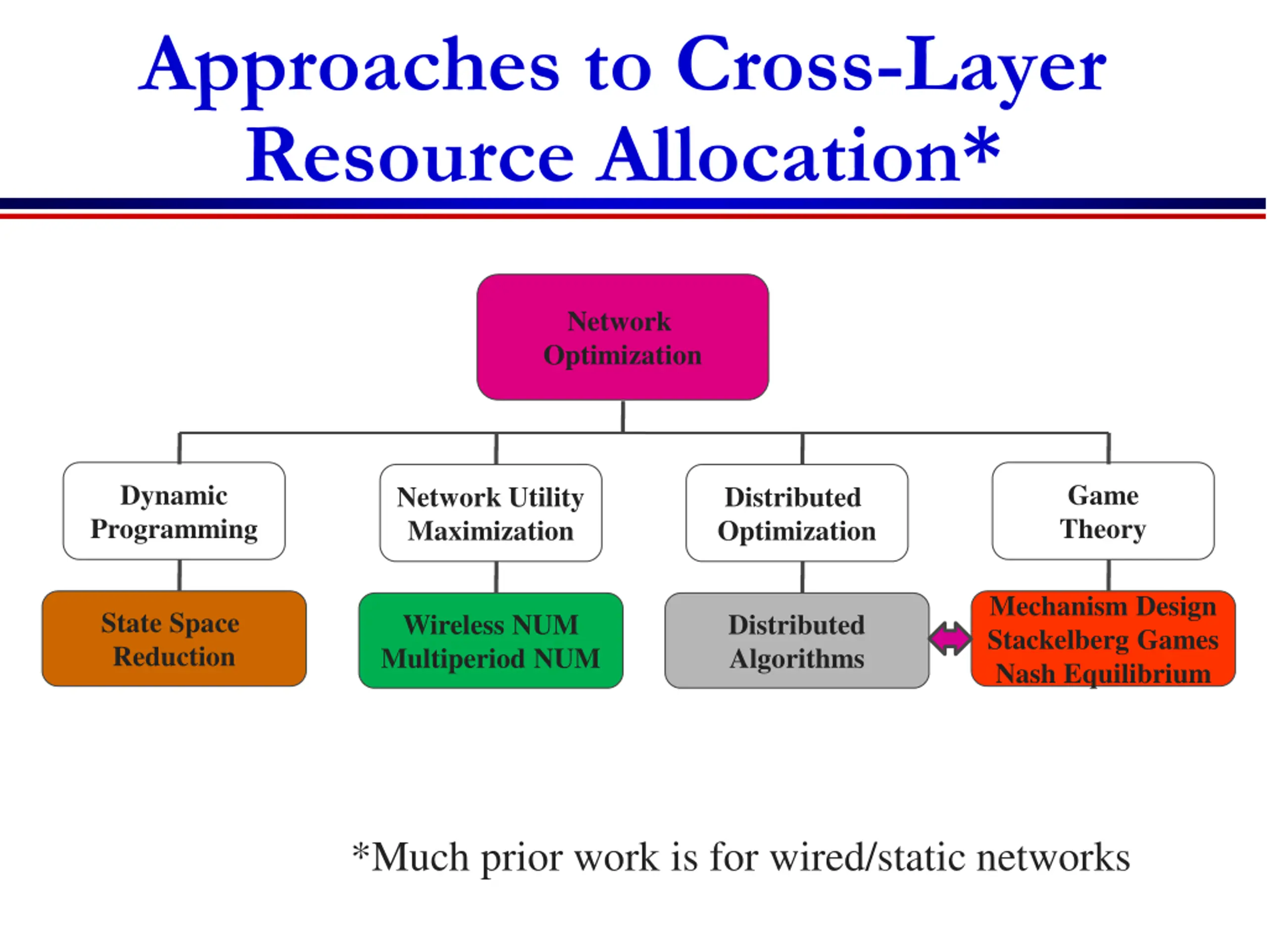 Approaches to Cross-Layer Resource Allocation* Network Optimization Dynamic Programming Game Theory Network Utility Maximization Distributed Optimization Mechanism Design Stackelberg Games Nash Equilibrium State Space Reduction Wireless NUM Multiperiod NUM Distributed Algorithms *Much prior work is for wired/static networks