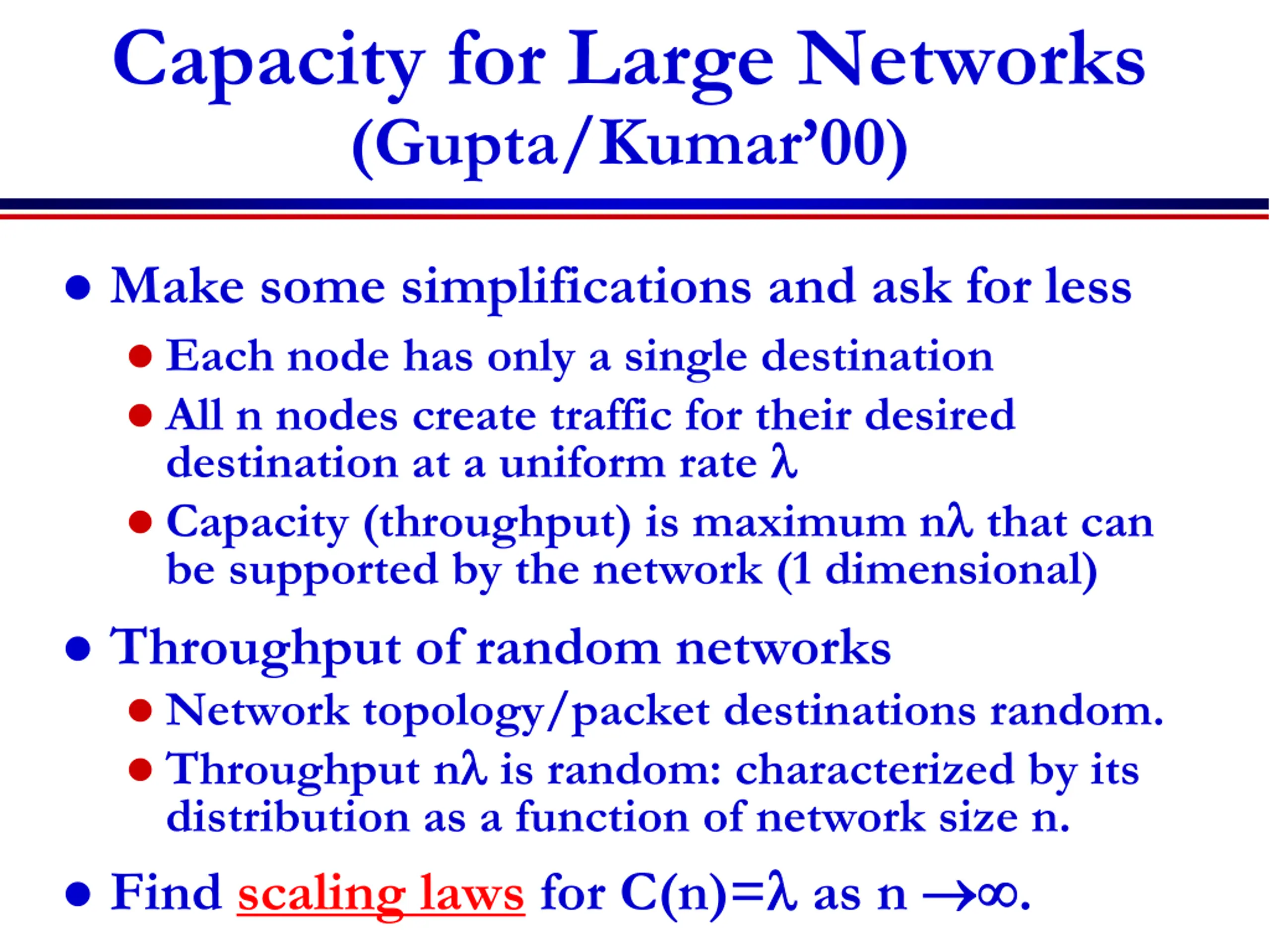 Capacity for Large Networks (Gupta/Kumar 00) Make some simplifications and ask for less Each node has only a single destination All n nodes create traffic for their desired destination at a uniform rate Capacity (throughput) is maximum n that can be supported by the network (1 dimensional) Throughput of random networks Network topology/packet destinations random. Throughput n is random: characterized by its distribution as a function of network size n. Find scaling laws for C(n)= as n .