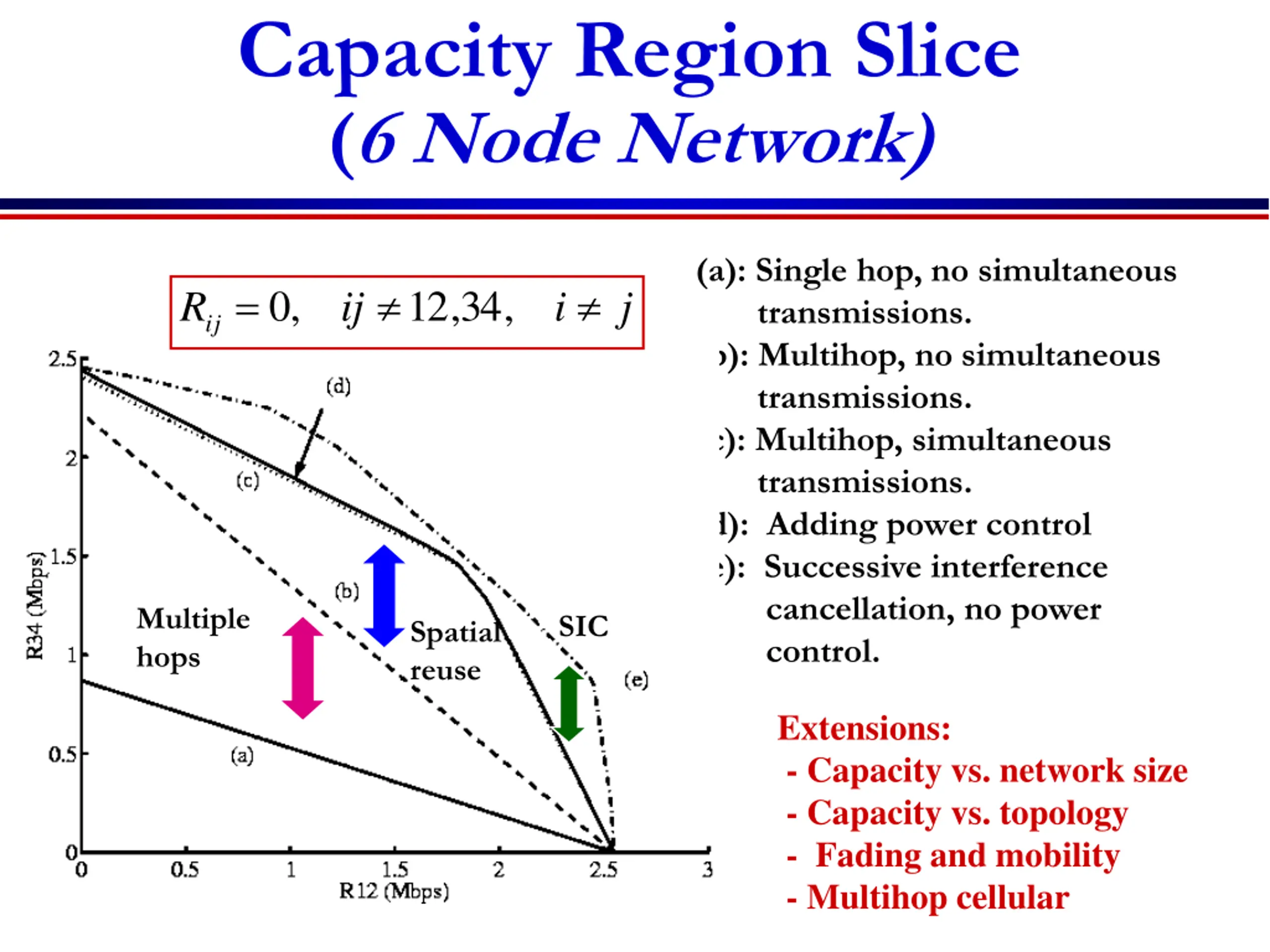 Capacity Region Slice (6 Node Network) (a): Single hop, no simultaneous transmissions. (b): Multihop, no simultaneous transmissions. (c): Multihop, simultaneous transmissions. (d): Adding power control (e): Successive interference cancellation, no power control. = , 0 12 34 , , Rij ij i j Multiple hops SIC Spatial reuse Extensions: - Capacity vs. network size - Capacity vs. topology - Fading and mobility - Multihop cellular