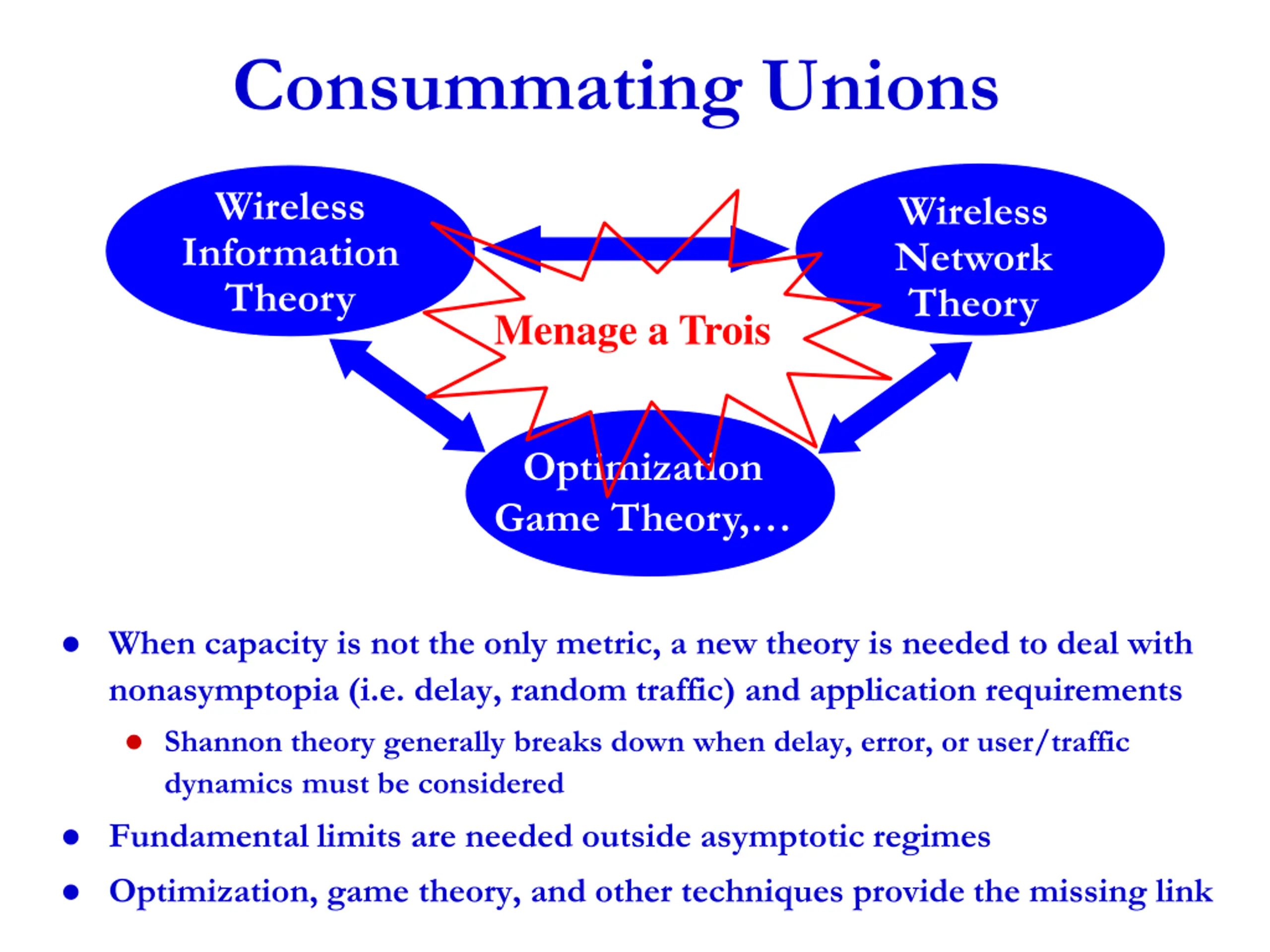 Consummating Unions Wireless Information Theory Wireless Network Theory Menage a Trois Optimization Game Theory, When capacity is not the only metric, a new theory is needed to deal with nonasymptopia (i.e. delay, random traffic) and application requirements Shannon theory generally breaks down when delay, error, or user/traffic dynamics must be considered Fundamental limits are needed outside asymptotic regimes Optimization, game theory, and other techniques provide the missing link