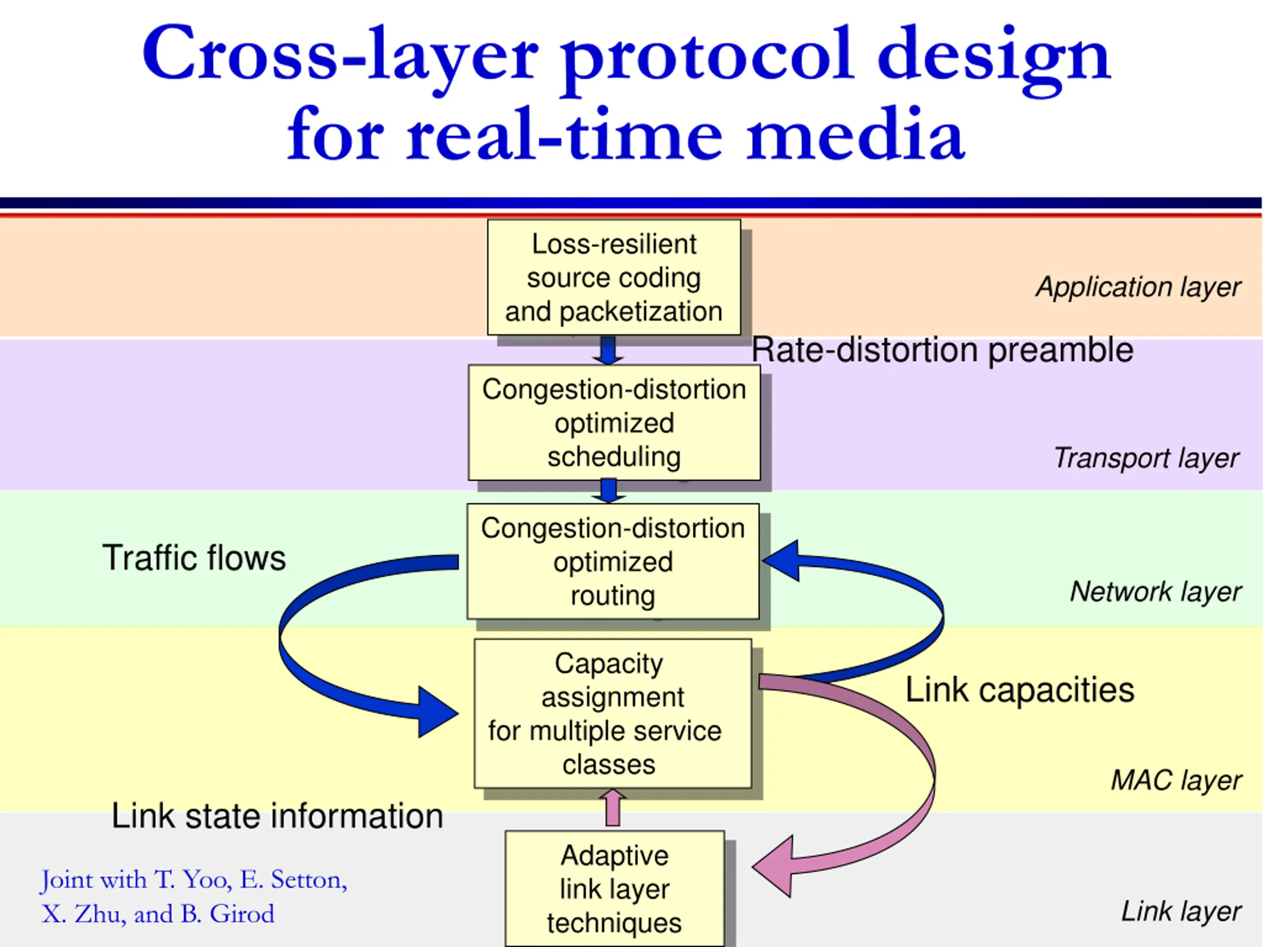 Cross-layer protocol design for real-time media Loss-resilient source coding and packetization Application layer Rate-distortion preamble Congestion-distortion optimized scheduling Transport layer Congestion-distortion optimized routing Traffic flows Network layer Capacity assignment for multiple service classes Link capacities MAC layer Link state information Adaptive link layer techniques Joint with T. Yoo, E. Setton, X. Zhu, and B. Girod Link layer