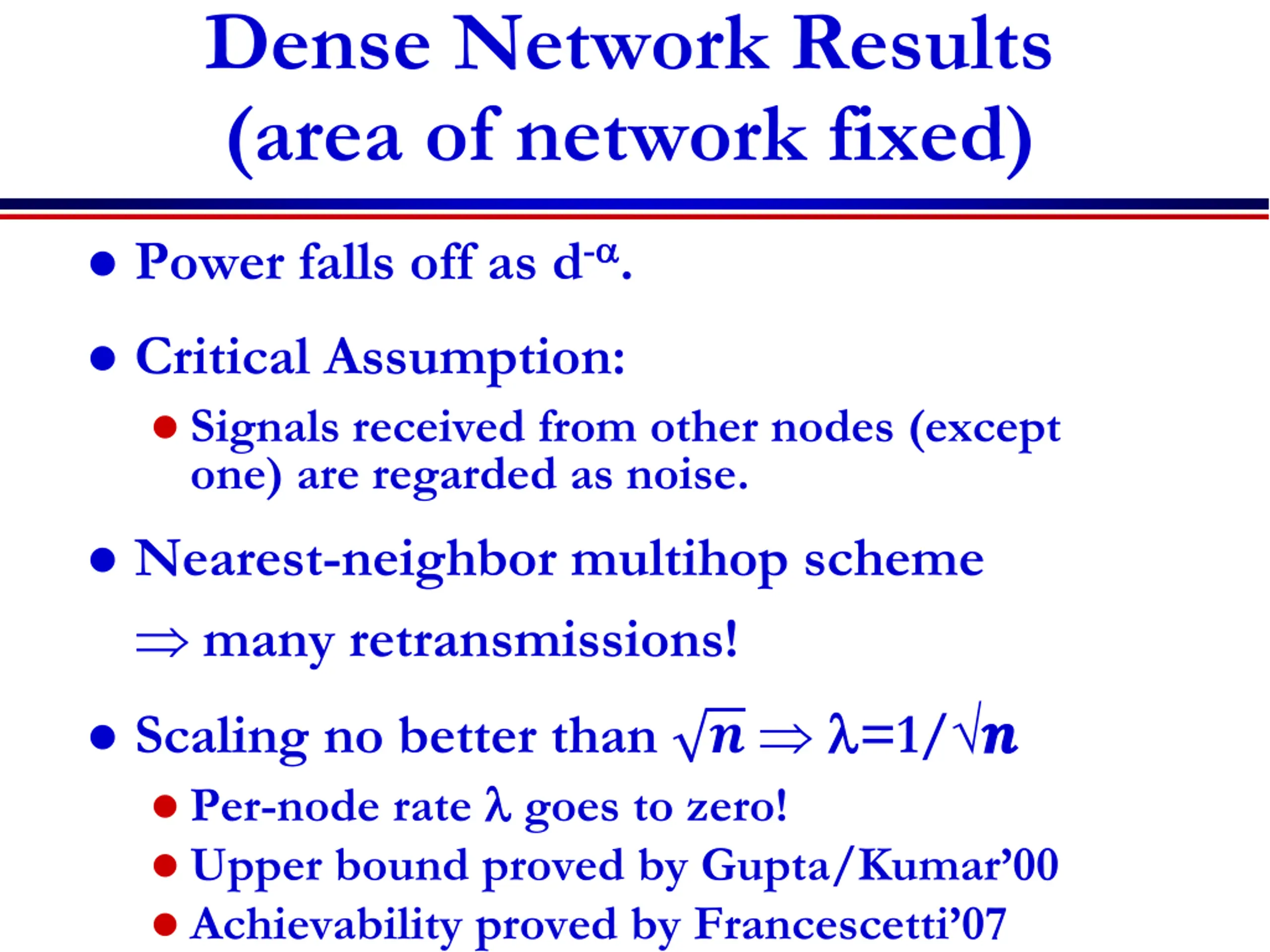 Dense Network Results (area of network fixed) Power falls off as d- . Critical Assumption: Signals received from other nodes (except one) are regarded as noise. Nearest-neighbor multihop scheme many retransmissions! Scaling no better than ? =1/ ? ? Per-node rate goes to zero! Upper bound proved by Gupta/Kumar 00 Achievability proved by Francescetti 07