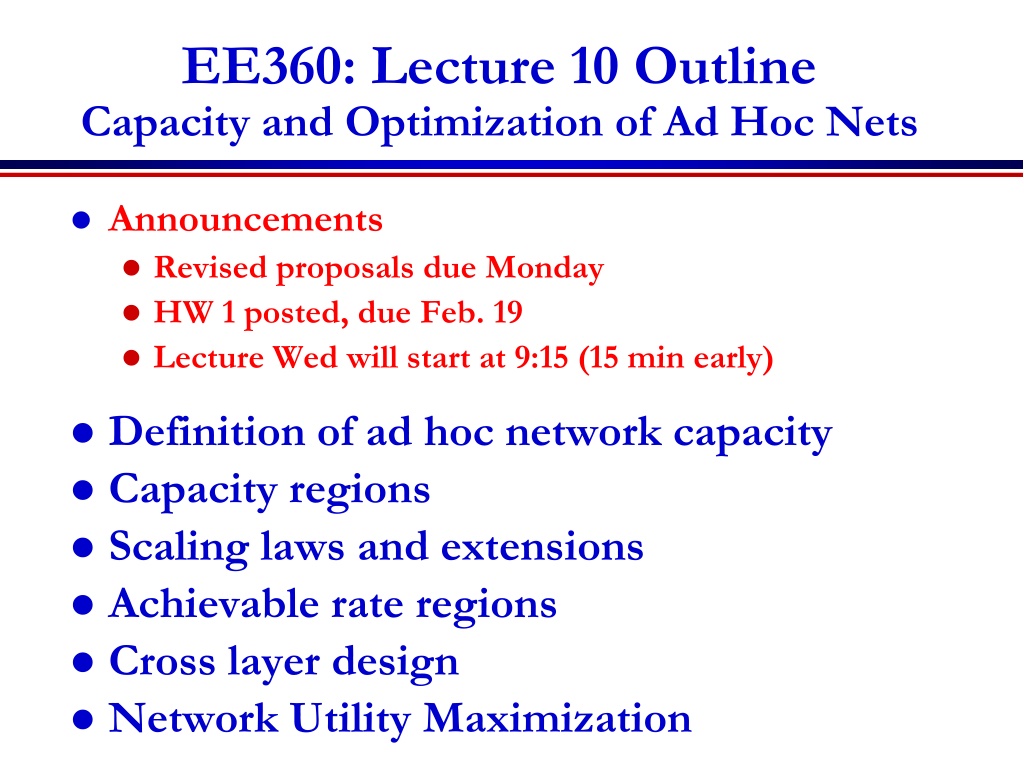 EE360: Lecture 10 Outline Capacity and Optimization of Ad Hoc Nets Announcements Revised proposals due Monday HW 1 posted, due Feb. 19 Lecture Wed will start at 9:15 (15 min early) Definition of ad hoc network capacity Capacity regions Scaling laws and extensions Achievable rate regions Cross layer design Network Utility Maximization