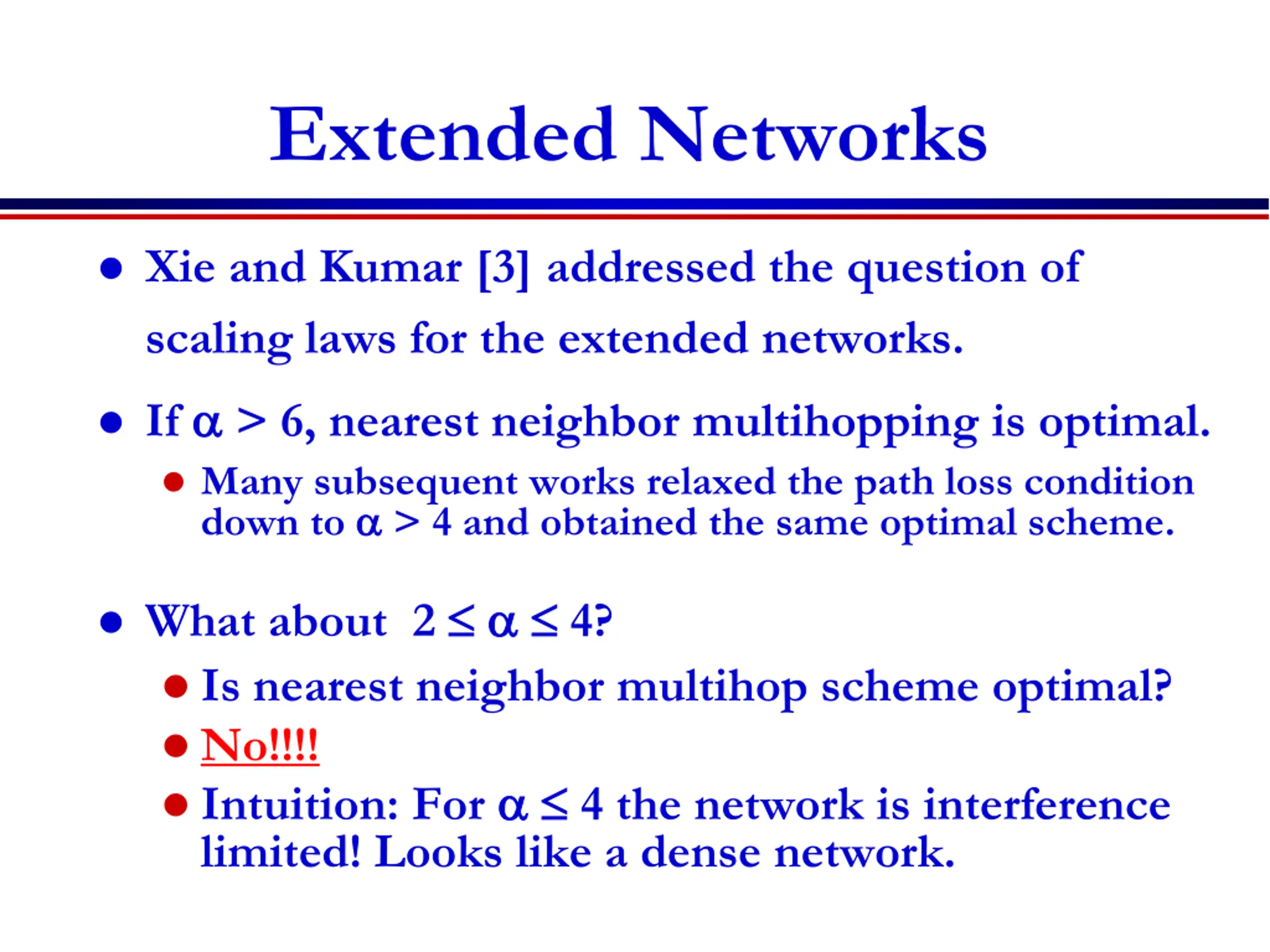 Extended Networks Xie and Kumar [3] addressed the question of scaling laws for the extended networks. If > 6, nearest neighbor multihopping is optimal. Many subsequent works relaxed the path loss condition down to > 4 and obtained the same optimal scheme. What about 2 4? Is nearest neighbor multihop scheme optimal? No!!!! Intuition: For 4 the network is interference limited! Looks like a dense network.