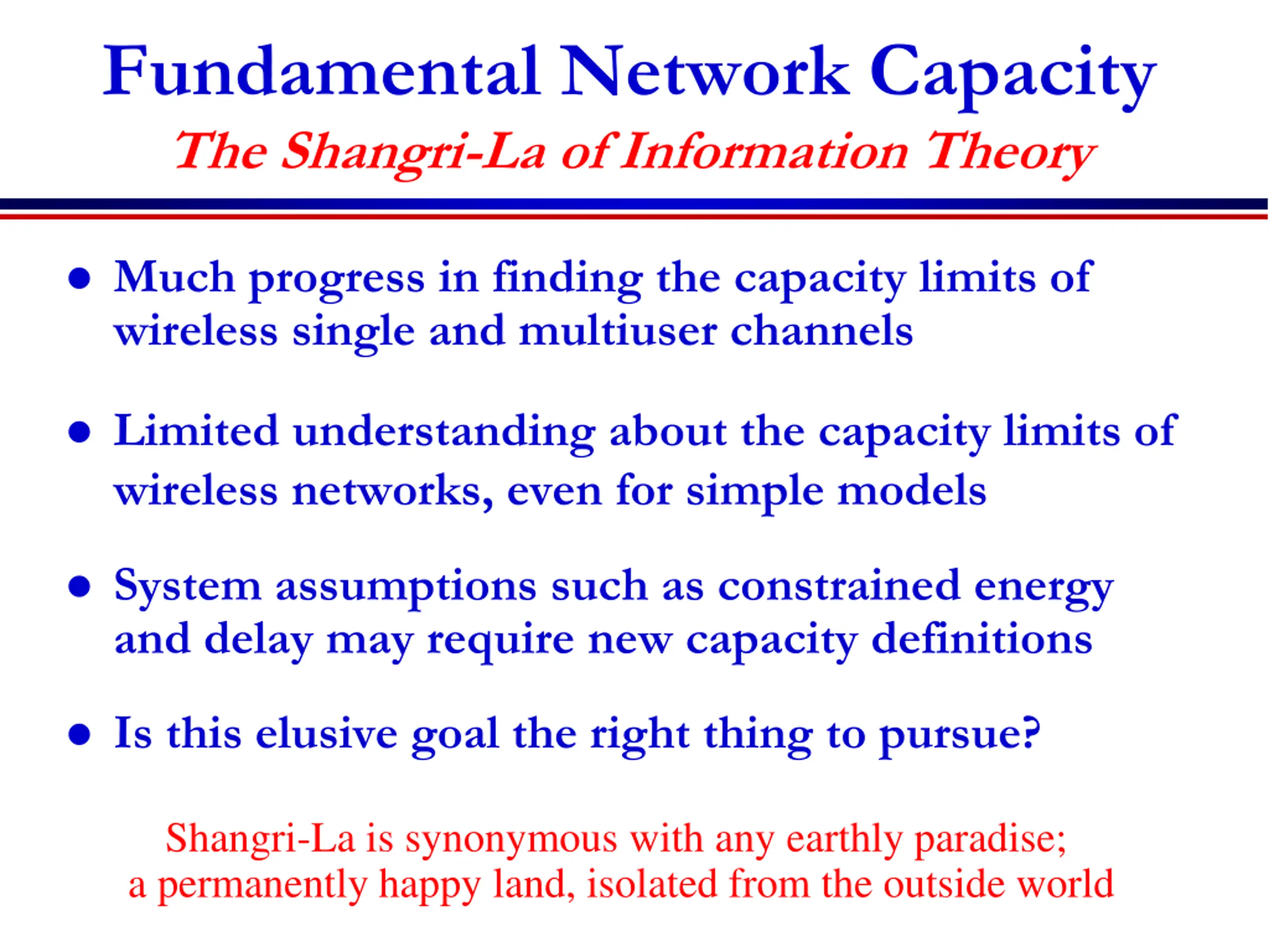 Fundamental Network Capacity The Shangri-La of Information Theory Much progress in finding the capacity limits of wireless single and multiuser channels Limited understanding about the capacity limits of wireless networks, even for simple models System assumptions such as constrained energy and delay may require new capacity definitions Is this elusive goal the right thing to pursue? Shangri-La is synonymous with any earthly paradise; a permanently happy land, isolated from the outside world