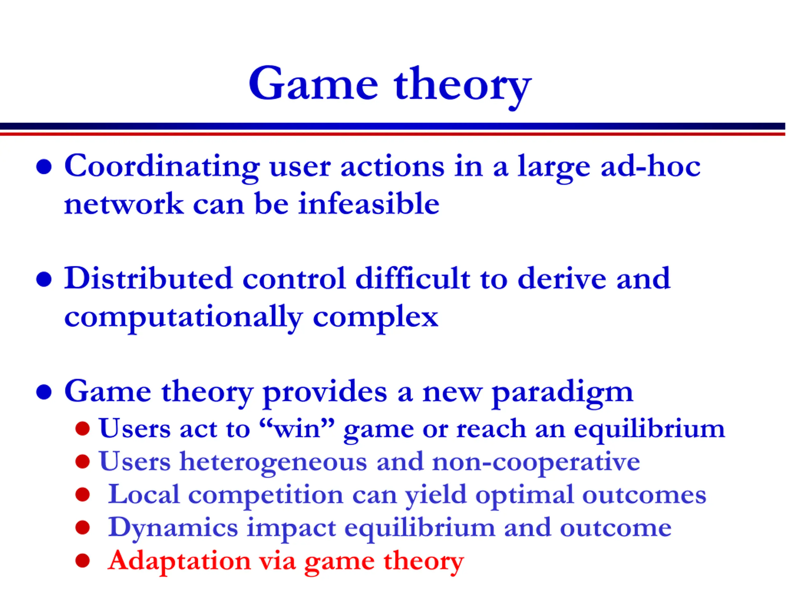 Game theory Coordinating user actions in a large ad-hoc network can be infeasible Distributed control difficult to derive and computationally complex Game theory provides a new paradigm Users act to win game or reach an equilibrium Users heterogeneous and non-cooperative Local competition can yield optimal outcomes Dynamics impact equilibrium and outcome Adaptation via game theory