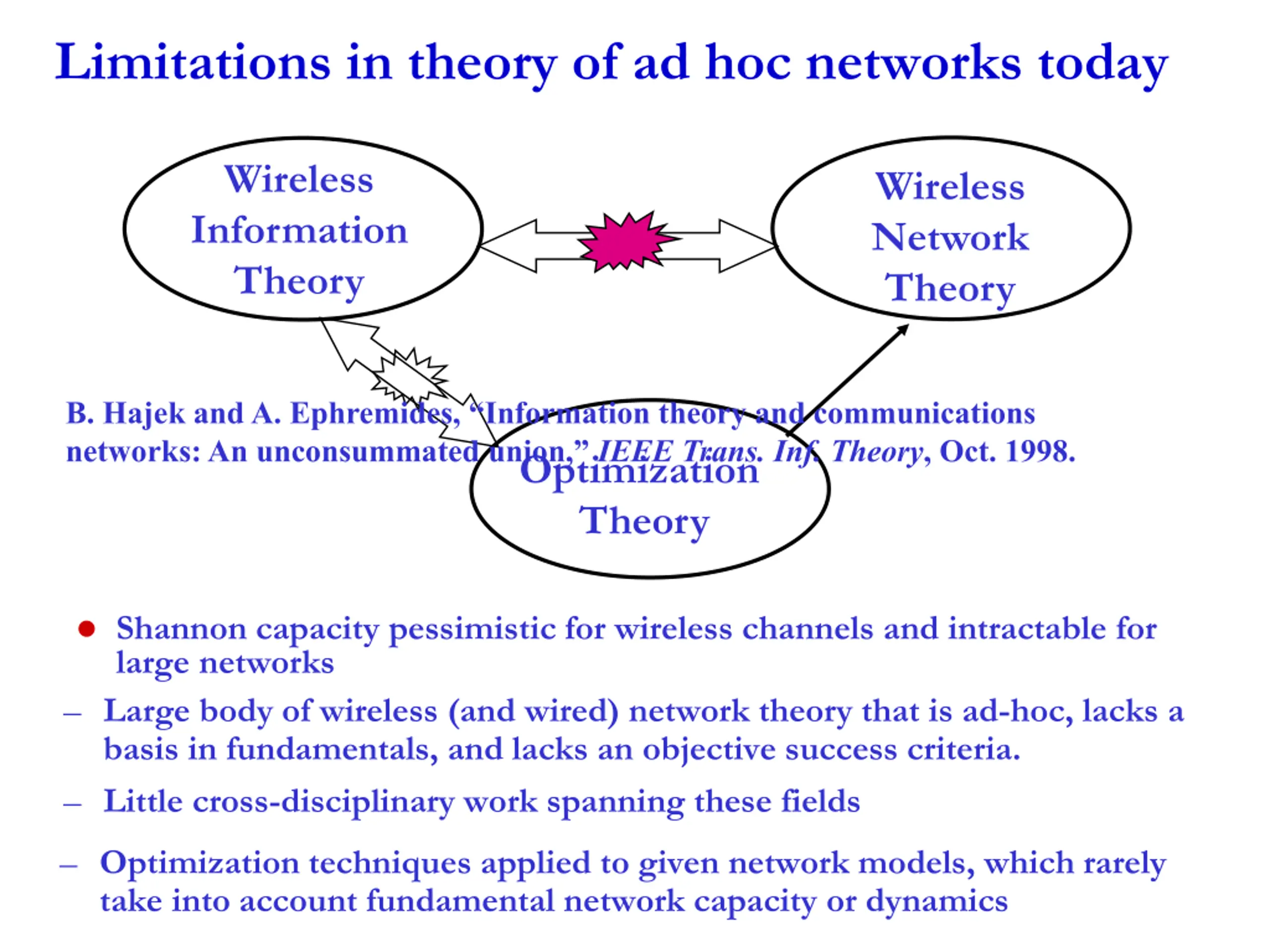 Limitations in theory of ad hoc networks today Wireless Information Theory Wireless Network Theory B. Hajek and A. Ephremides, Information theory and communications networks: An unconsummated union, IEEE Trans. Inf. Theory, Oct. 1998. Optimization Theory Shannon capacity pessimistic for wireless channels and intractable for large networks Large body of wireless (and wired) network theory that is ad-hoc, lacks a basis in fundamentals, and lacks an objective success criteria. Little cross-disciplinary work spanning these fields Optimization techniques applied to given network models, which rarely take into account fundamental network capacity or dynamics