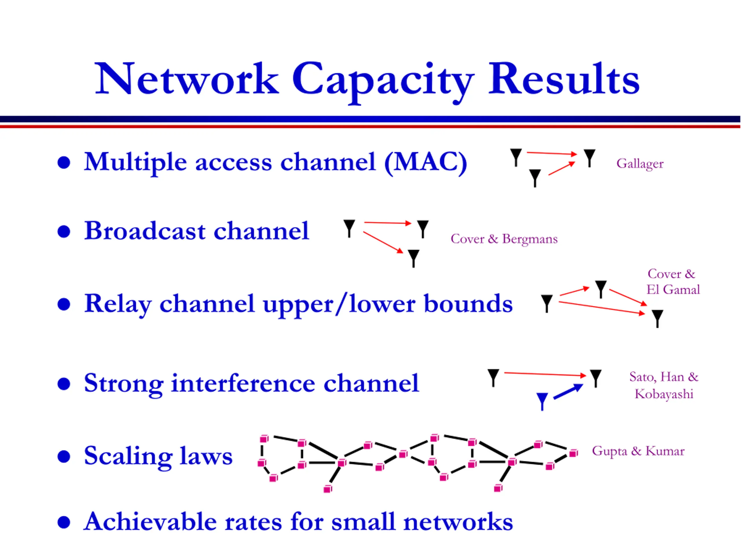 Network Capacity Results Multiple access channel (MAC) Gallager Broadcast channel Cover & Bergmans Cover & El Gamal Relay channel upper/lower bounds Strong interference channel Sato, Han & Kobayashi Scaling laws Gupta & Kumar Achievable rates for small networks