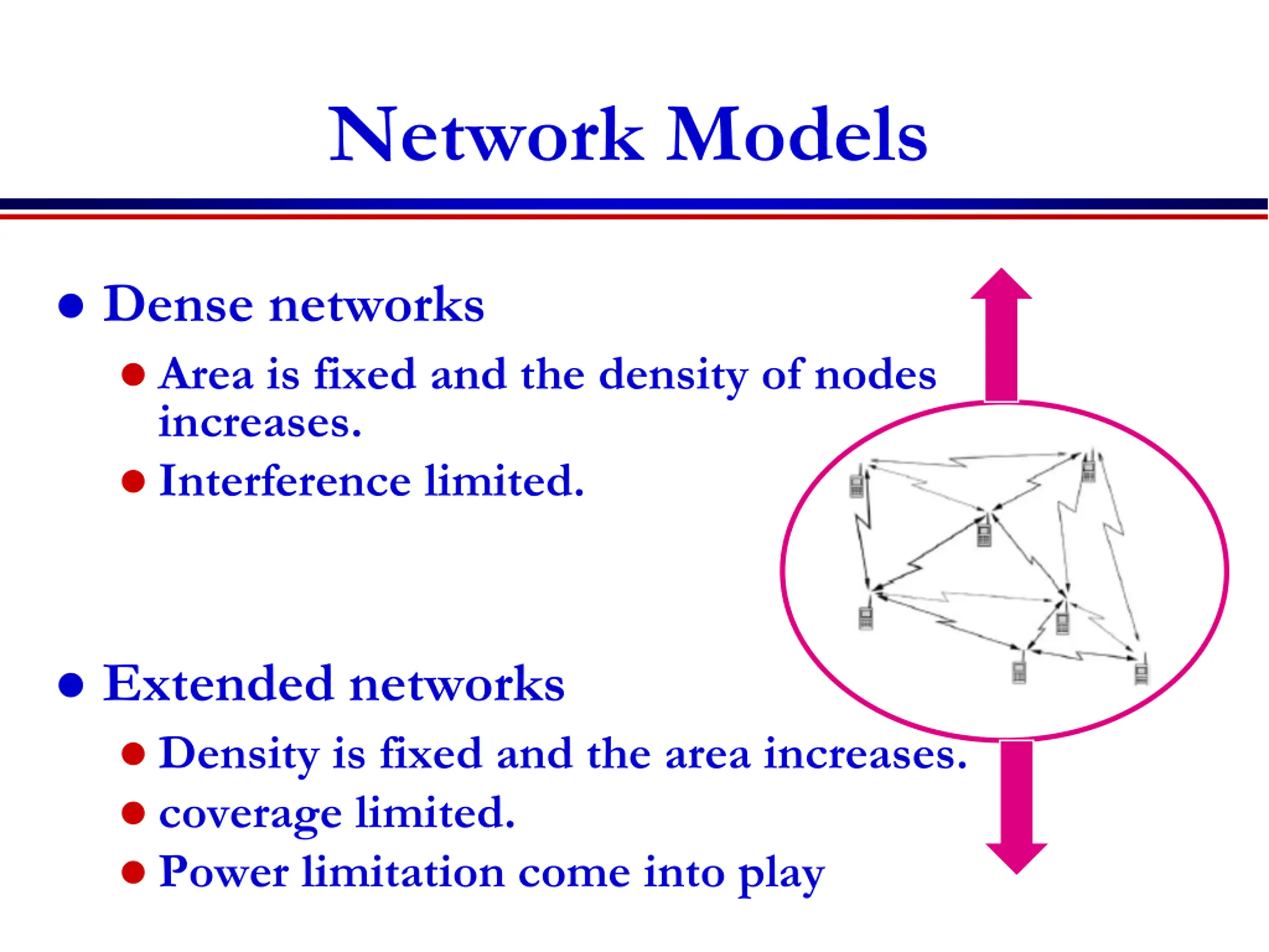 Network Models Dense networks Area is fixed and the density of nodes increases. Interference limited. Extended networks Density is fixed and the area increases. coverage limited. Power limitation come into play