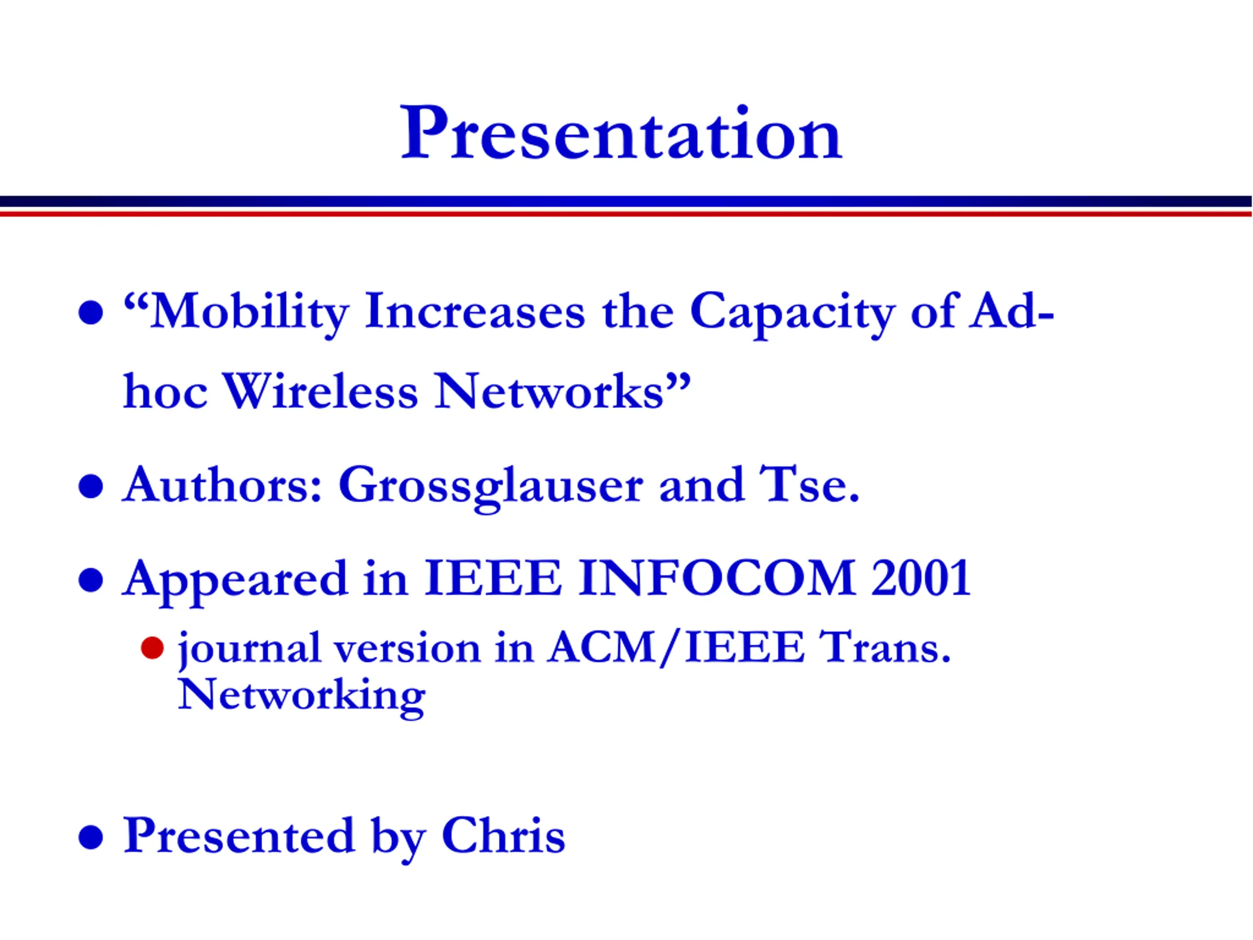 Presentation Mobility Increases the Capacity of Ad- hoc Wireless Networks Authors: Grossglauser and Tse. Appeared in IEEE INFOCOM 2001 journal version in ACM/IEEE Trans. Networking Presented by Chris