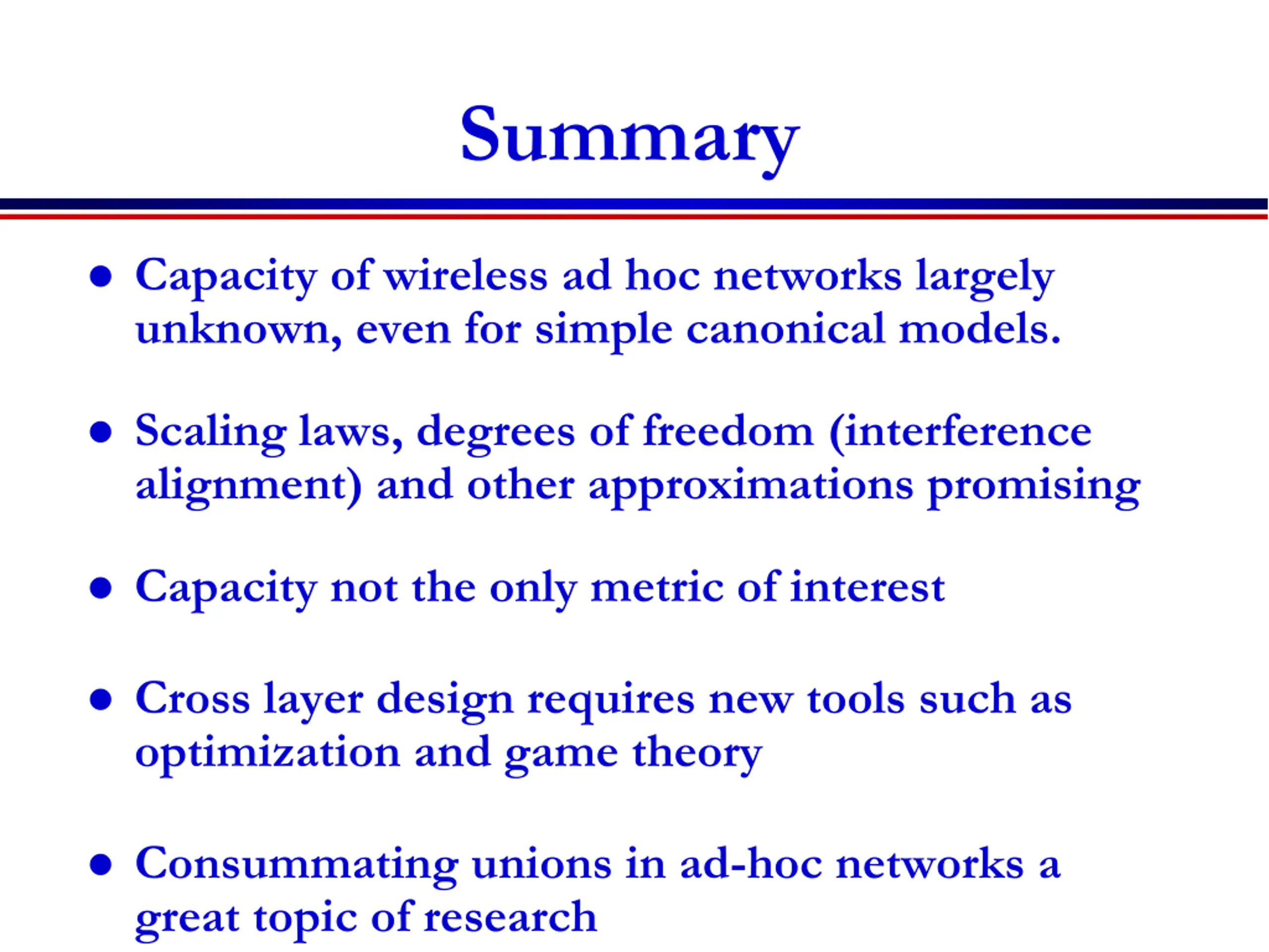 Summary Capacity of wireless ad hoc networks largely unknown, even for simple canonical models. Scaling laws, degrees of freedom (interference alignment) and other approximations promising Capacity not the only metric of interest Cross layer design requires new tools such as optimization and game theory Consummating unions in ad-hoc networks a great topic of research