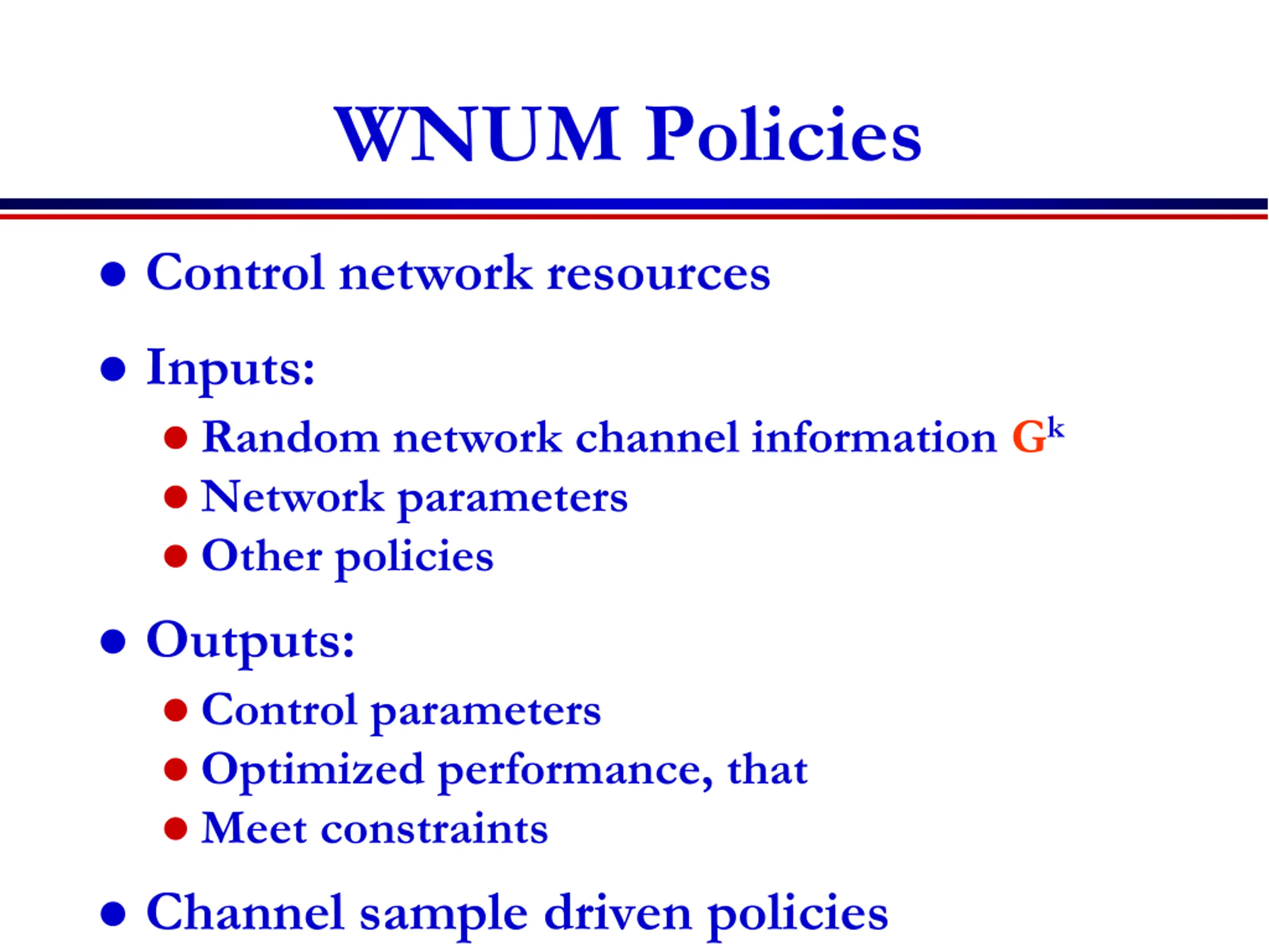 WNUM Policies Control network resources Inputs: Random network channel information Gk Network parameters Other policies Outputs: Control parameters Optimized performance, that Meet constraints Channel sample driven policies