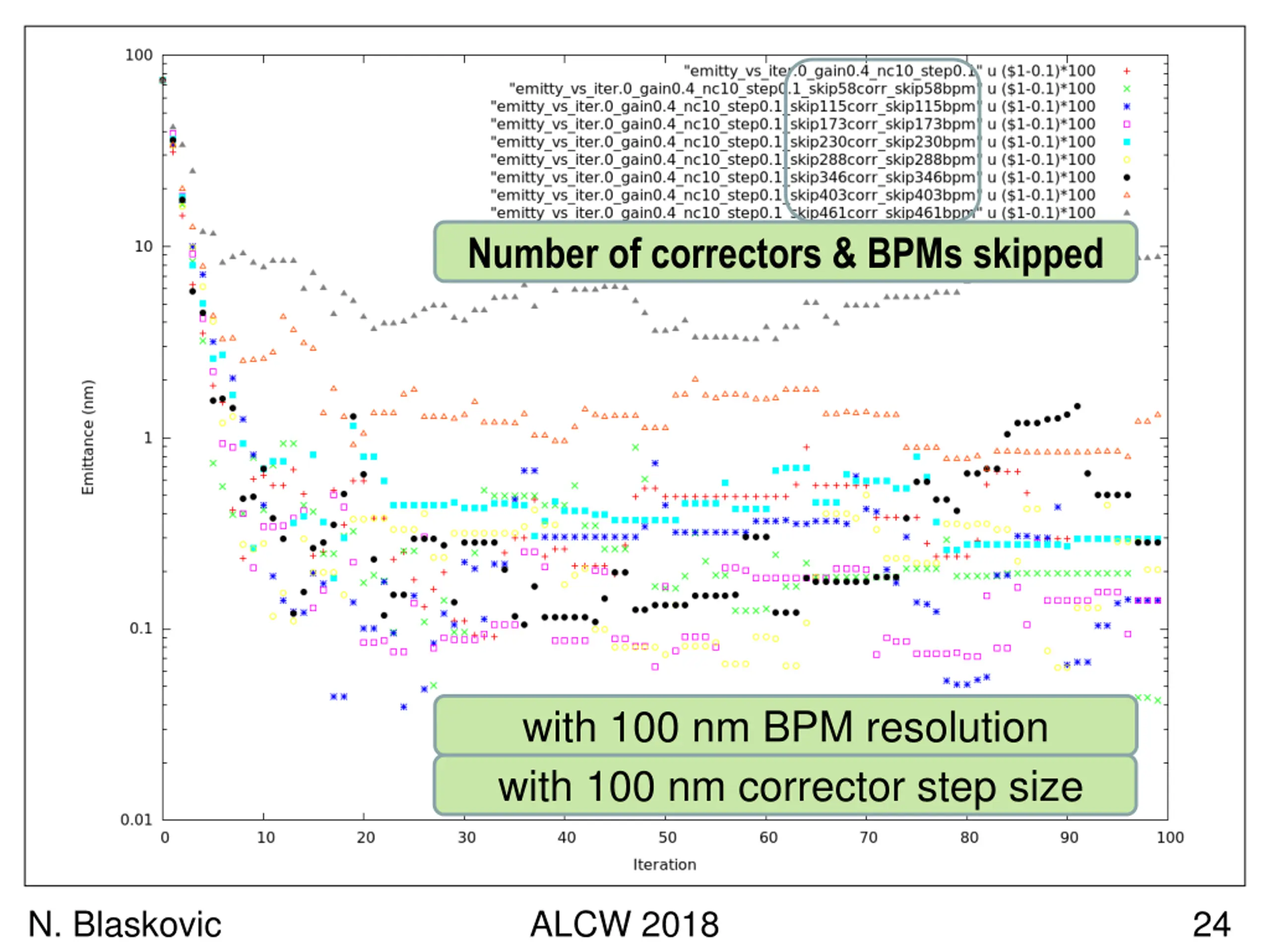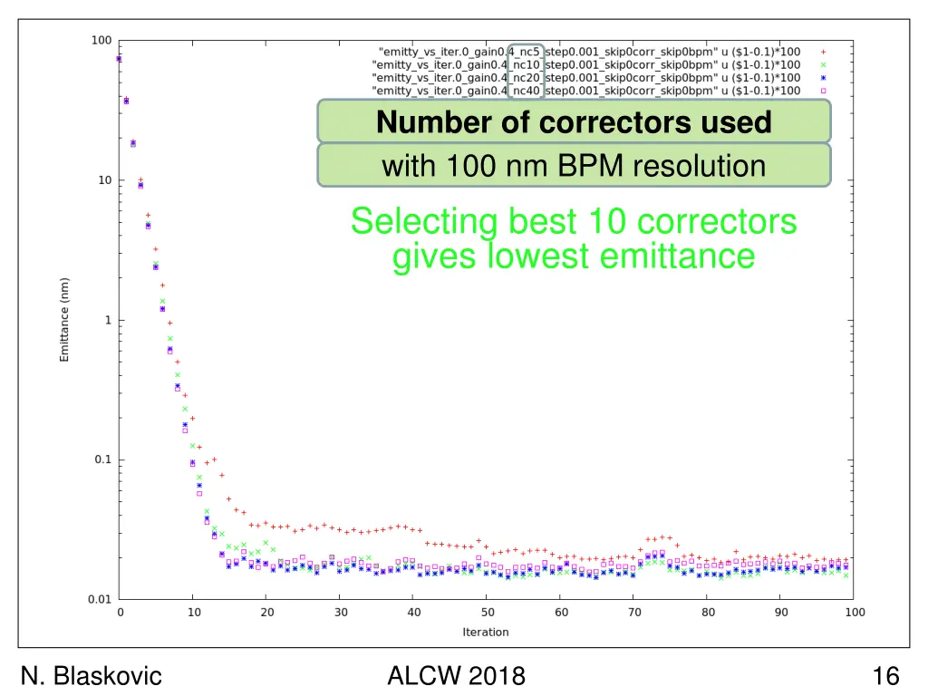Gain scan Number of correctors used with 100 nm BPM resolution Selecting best 10 correctors gives lowest emittance N. Blaskovic ALCW 2018 16