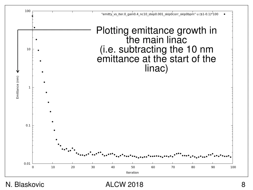 Running MICADO Run ATL motion for 1 hour starting from a perfectly aligned machine Run MICADO for 100 consecutive iterations assuming no additional ground motion during this period Figure of merit is the reduction in the emittance growth in the linac versus MICADO iteration number N. Blaskovic ALCW 2018 7