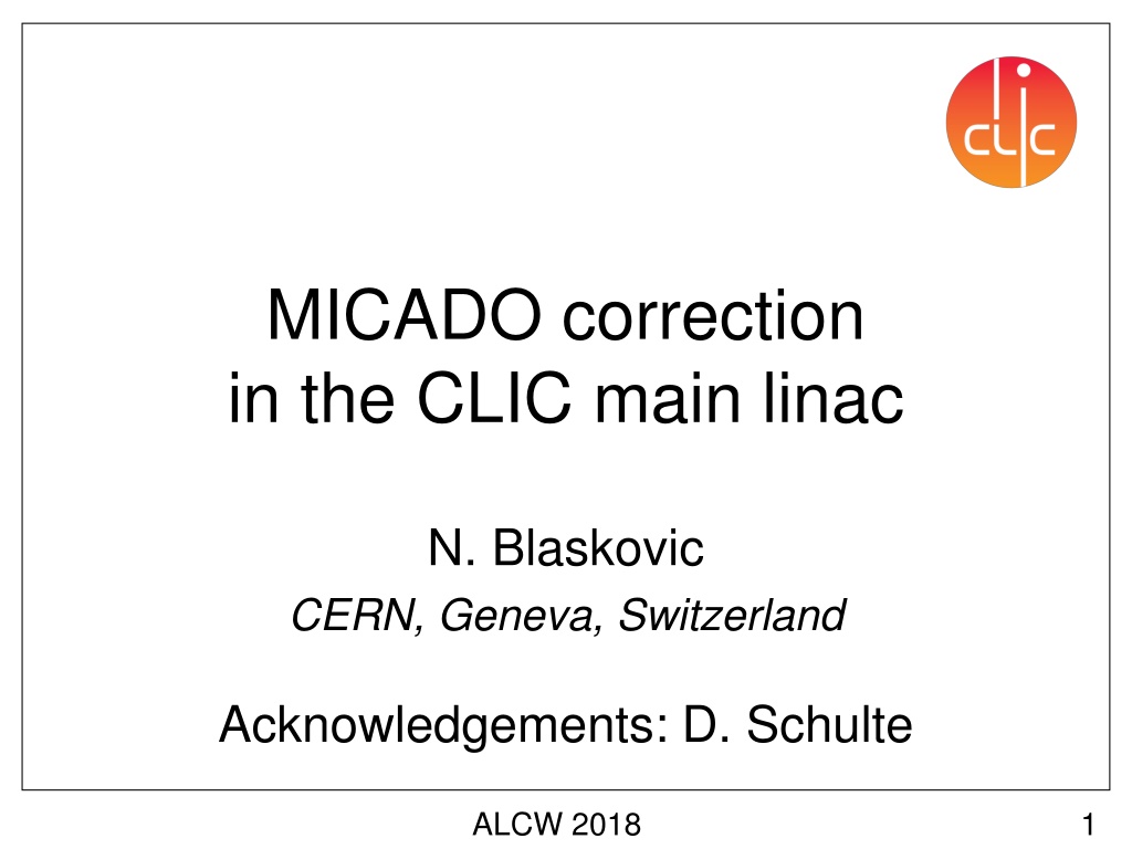MICADO correction in the CLIC main linac N. Blaskovic CERN, Geneva, Switzerland Acknowledgements: D. Schulte ALCW 2018 1