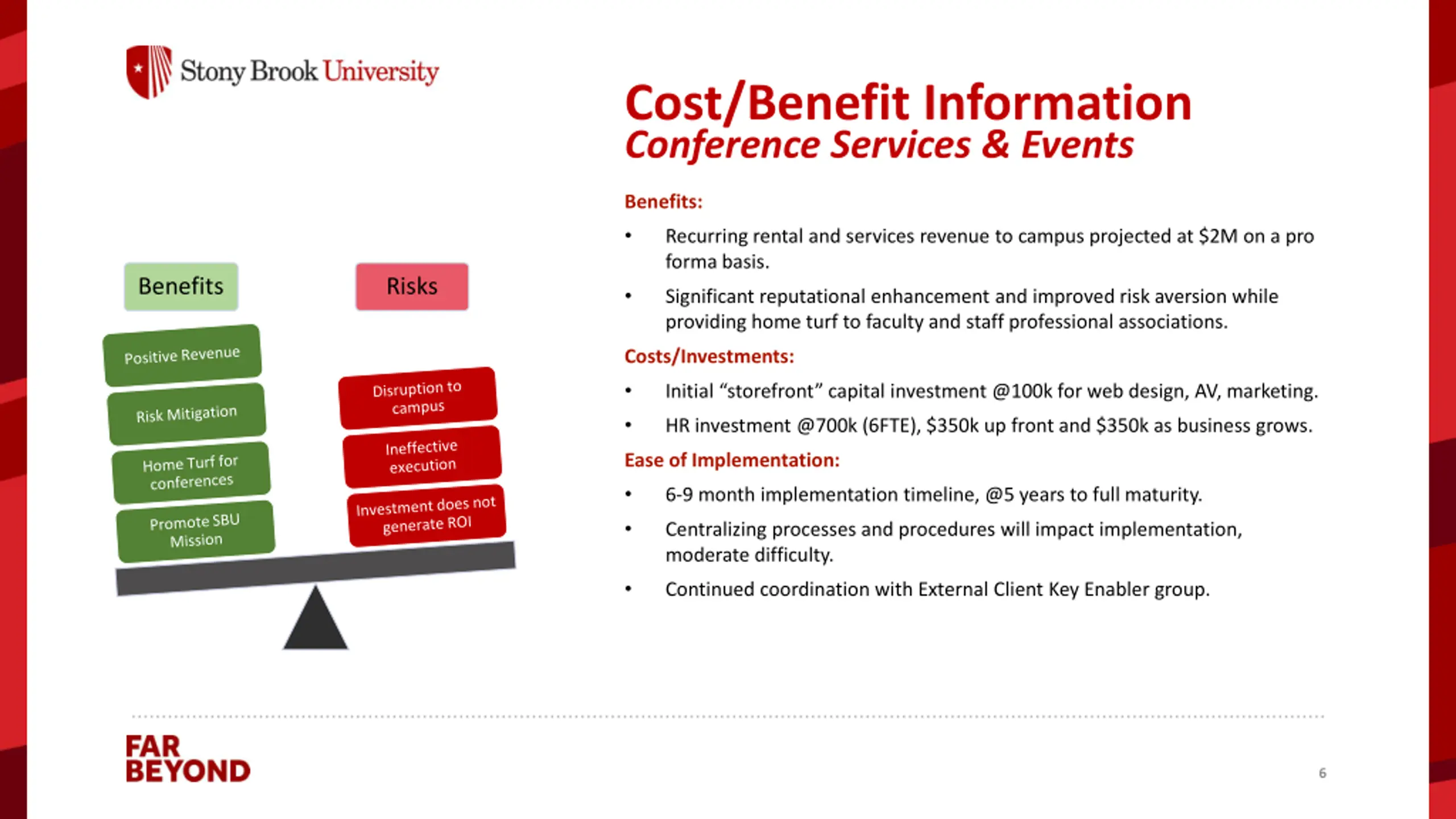 Cost/Benefit Information Conference Services & Events Benefits: Recurring rental and services revenue to campus projected at $2M on a pro forma basis. Benefits Risks Significant reputational enhancement and improved risk aversion while providing home turf to faculty and staff professional associations. Costs/Investments: Initial storefront capital investment @100k for web design, AV, marketing. HR investment @700k (6FTE), $350k up front and $350k as business grows. Ease of Implementation: 6-9 month implementation timeline, @5 years to full maturity. Centralizing processes and procedures will impact implementation, moderate difficulty. Continued coordination with External Client Key Enabler group. 6