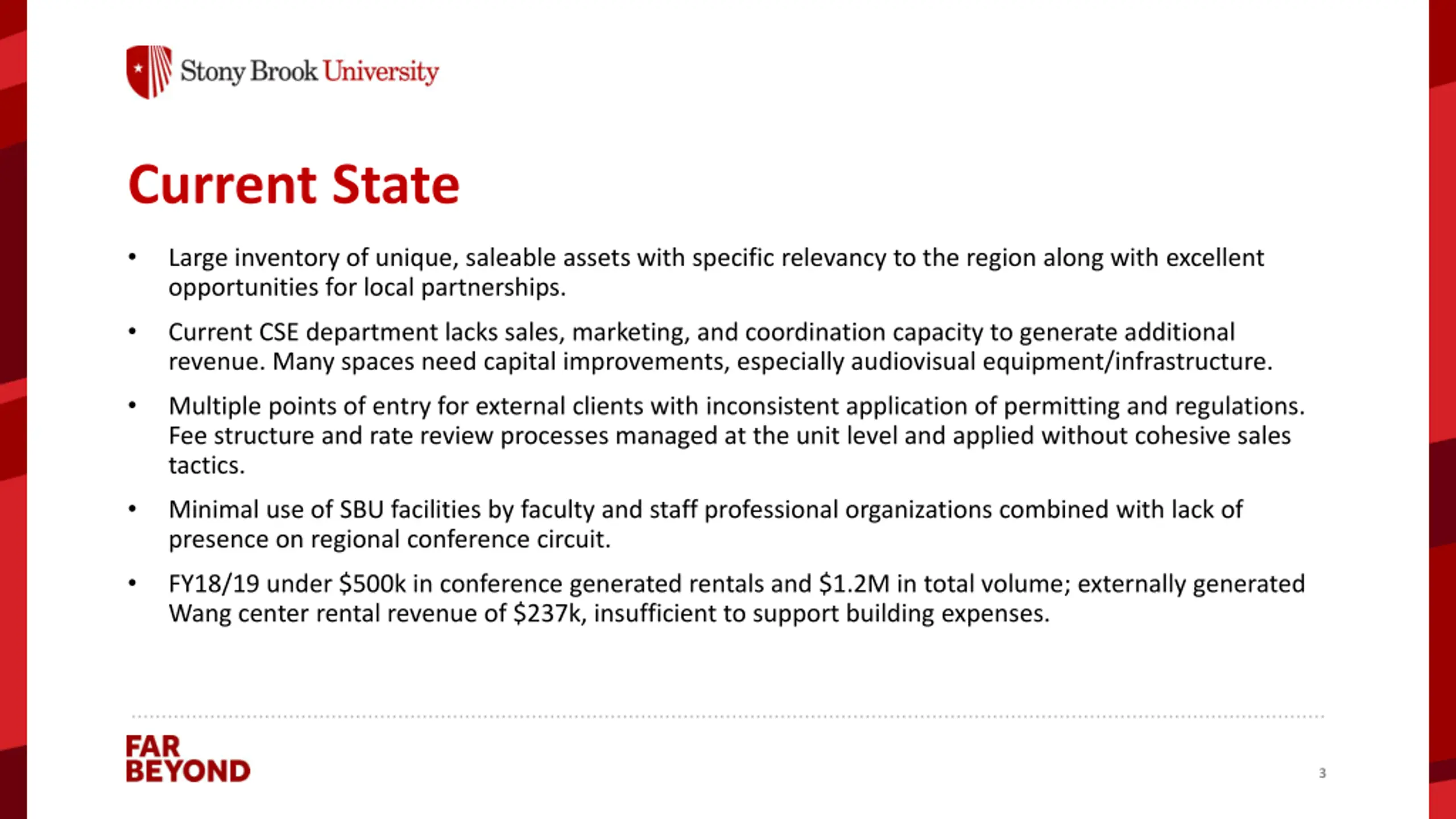 Current State Large inventory of unique, saleable assets with specific relevancy to the region along with excellent opportunities for local partnerships. Current CSE department lacks sales, marketing, and coordination capacity to generate additional revenue. Many spaces need capital improvements, especially audiovisual equipment/infrastructure. Multiple points of entry for external clients with inconsistent application of permitting and regulations. Fee structure and rate review processes managed at the unit level and applied without cohesive sales tactics. Minimal use of SBU facilities by faculty and staff professional organizations combined with lack of presence on regional conference circuit. FY18/19 under $500k in conference generated rentals and $1.2M in total volume; externally generated Wang center rental revenue of $237k, insufficient to support building expenses. 3