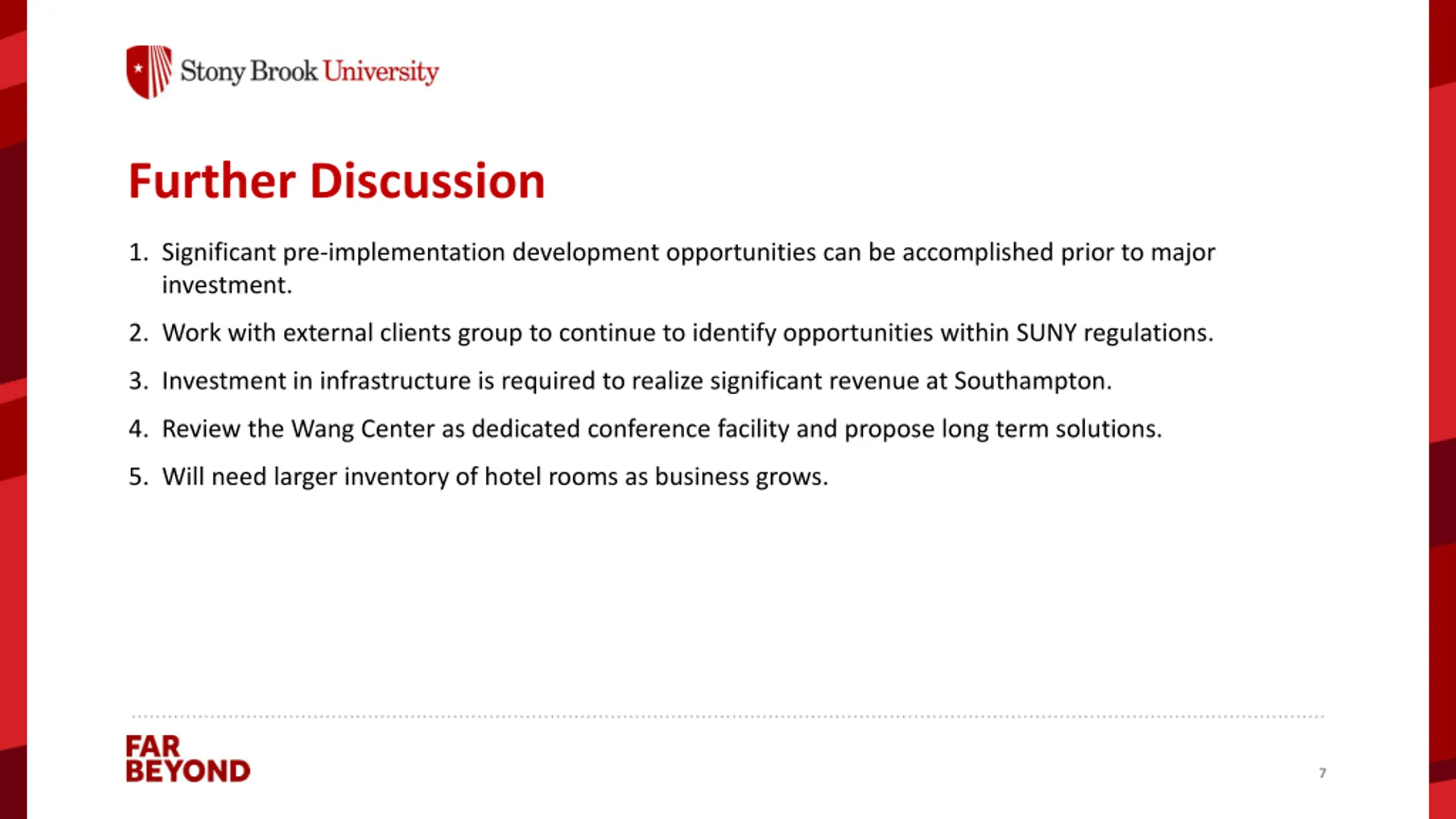 Further Discussion 1. Significant pre-implementation development opportunities can be accomplished prior to major investment. 2. Work with external clients group to continue to identify opportunities within SUNY regulations. 3. Investment in infrastructure is required to realize significant revenue at Southampton. 4. Review the Wang Center as dedicated conference facility and propose long term solutions. 5. Will need larger inventory of hotel rooms as business grows. 7