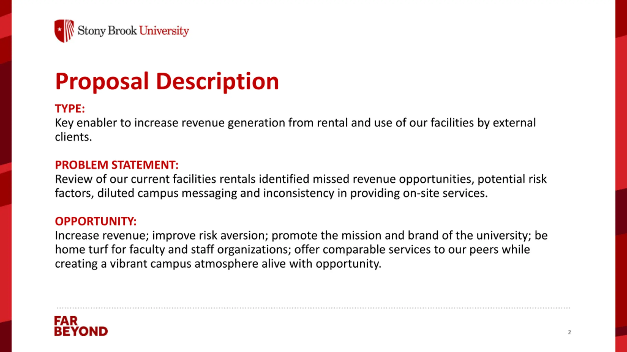 Proposal Description TYPE: Key enabler to increase revenue generation from rental and use of our facilities by external clients. PROBLEM STATEMENT: Review of our current facilities rentals identified missed revenue opportunities, potential risk factors, diluted campus messaging and inconsistency in providing on-site services. OPPORTUNITY: Increase revenue; improve risk aversion; promote the mission and brand of the university; be home turf for faculty and staff organizations; offer comparable services to our peers while creating a vibrant campus atmosphere alive with opportunity. 2