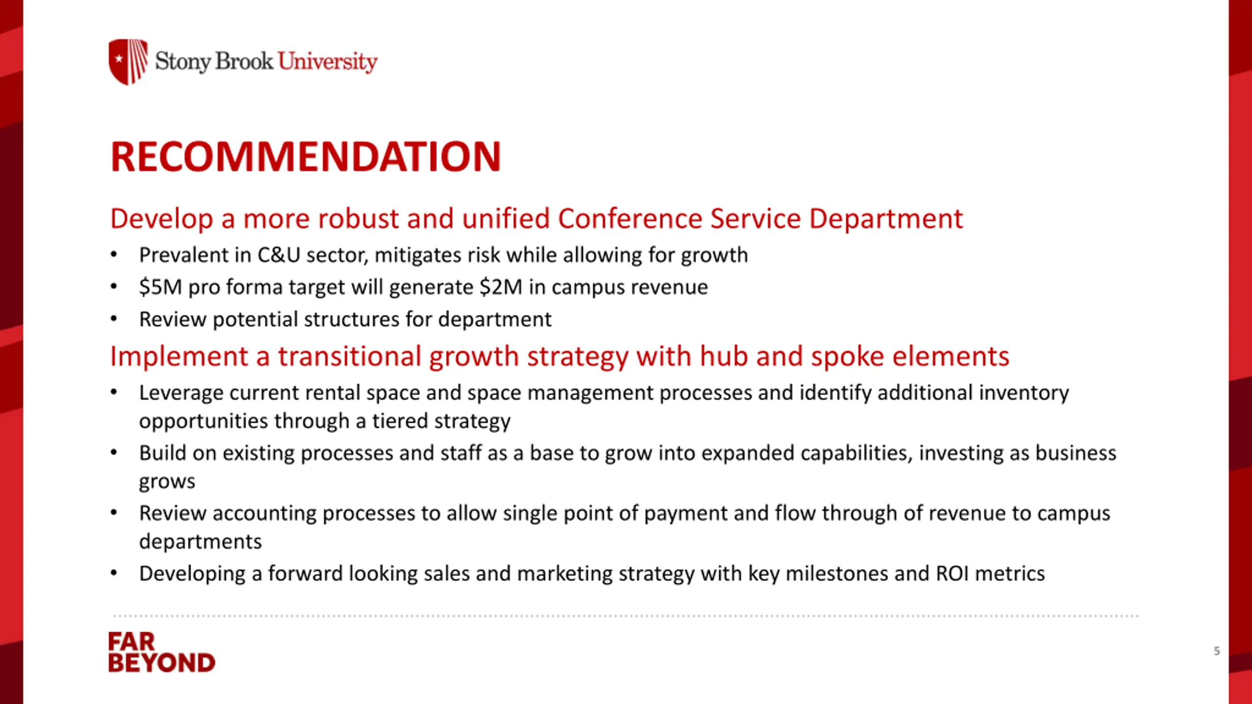 Opportunity Increase revenue to the University with existing space inventory and continue to develop inventory as sales grow. Adopt sound risk aversion strategies with uniform campus contracts and policy compliance managed through a single point of control. Reinforce the mission and brand of Stony Brook University locally, regionally and nationally as well as within various professional organizations. Support campus programming while providing home turf for faculty and staff external initiatives and professional organizations. Offer hospitality services comparable to other AAU and R1 institutions. Provide deeper learning opportunities for student employees and interns. 4