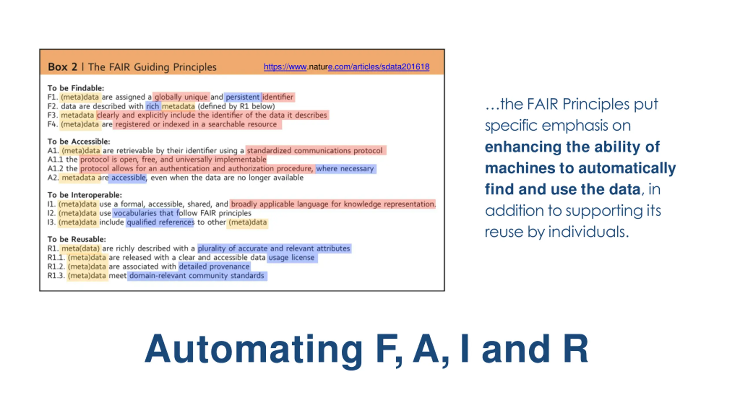 https://www.nature.com/articles/sdata201618 the FAIR Principles put specific emphasis on enhancing the ability of machines to automatically find and use the data, in addition to supporting its reuse by individuals. Automating F, A, I and R