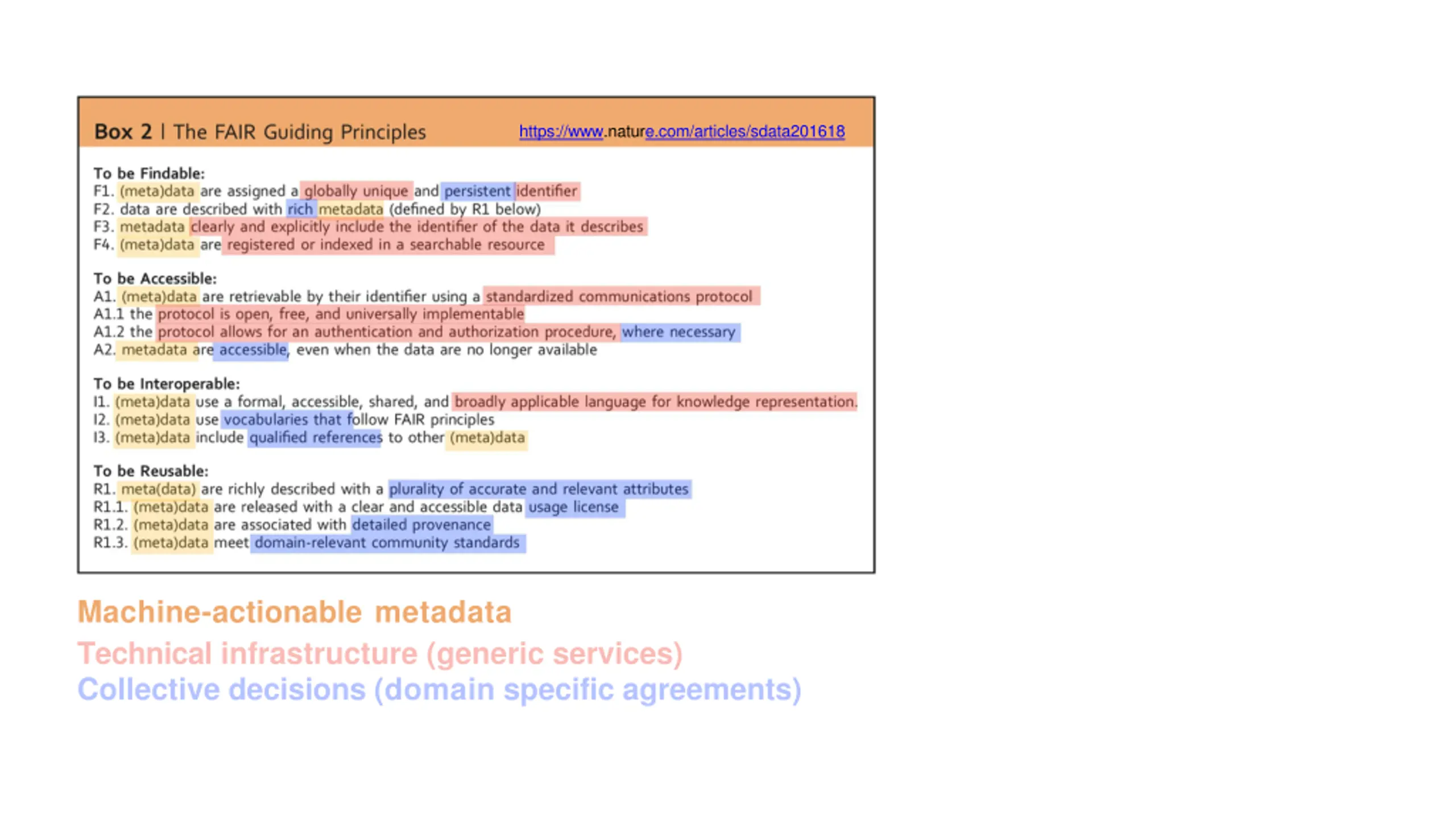 https://www.nature.com/articles/sdata201618 the FAIR Principles put specific emphasis on enhancing the ability of machines to automatically find and use the data, in addition to supporting its reuse by individuals. Machine-actionable metadata Technical infrastructure (generic services) Collective decisions (domain specific agreements)