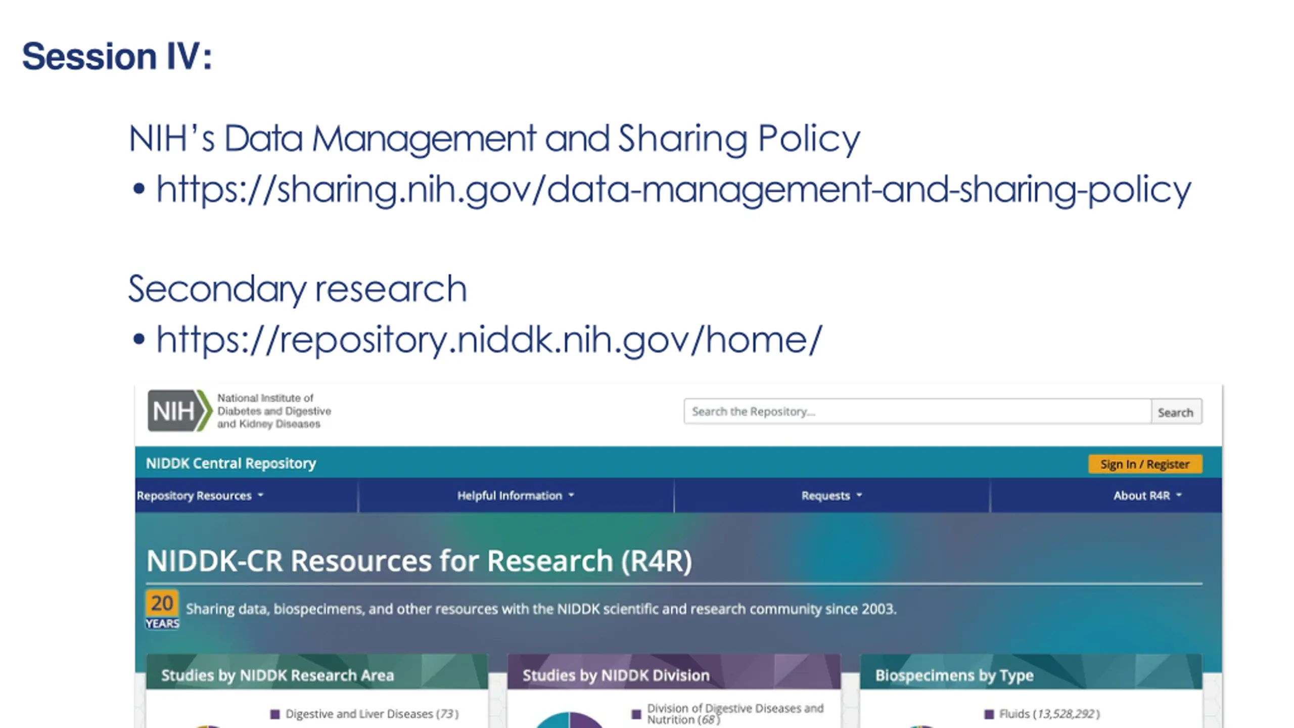 Session IV: NIH s Data Management and Sharing Policy https://sharing.nih.gov/data-management-and-sharing-policy Secondary research https://repository.niddk.nih.gov/home/