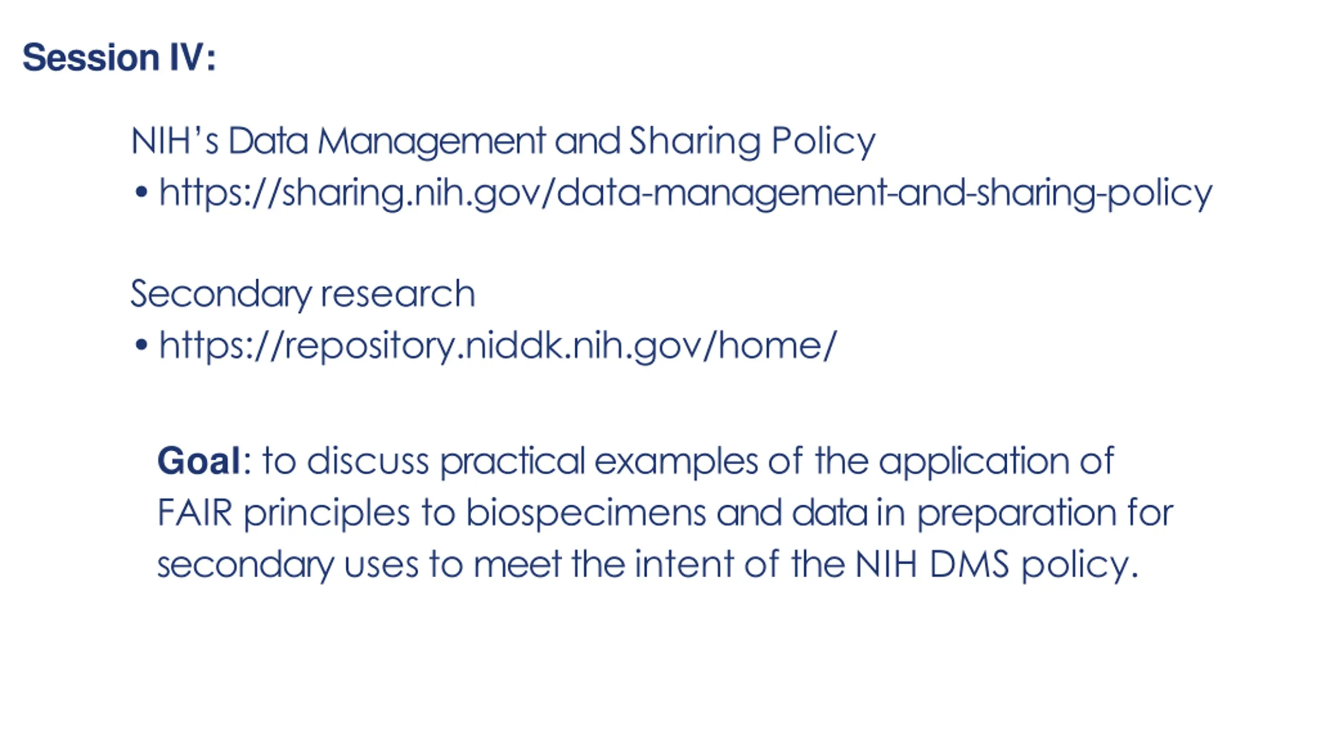Session IV: NIH s Data Management and Sharing Policy https://sharing.nih.gov/data-management-and-sharing-policy Secondary research https://repository.niddk.nih.gov/home/ Goal: to discuss practical examples of the application of FAIR principles to biospecimens and data in preparation for secondary uses to meet the intent of the NIH DMS policy.