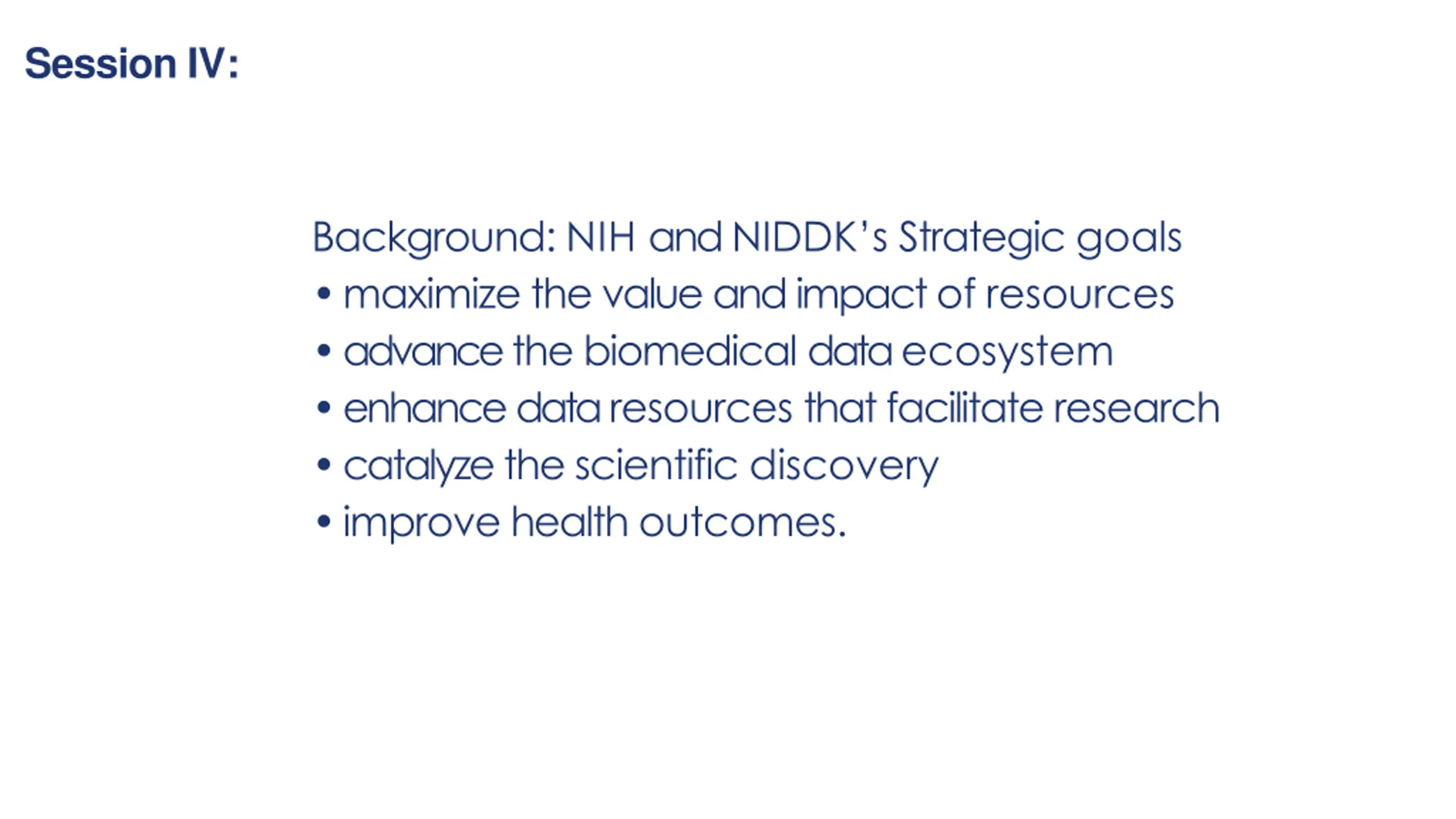 Session IV: Background: NIH and NIDDK s Strategic goals maximize the value and impact of resources advance the biomedical data ecosystem enhance data resources that facilitate research catalyze the scientific discovery improve health outcomes.