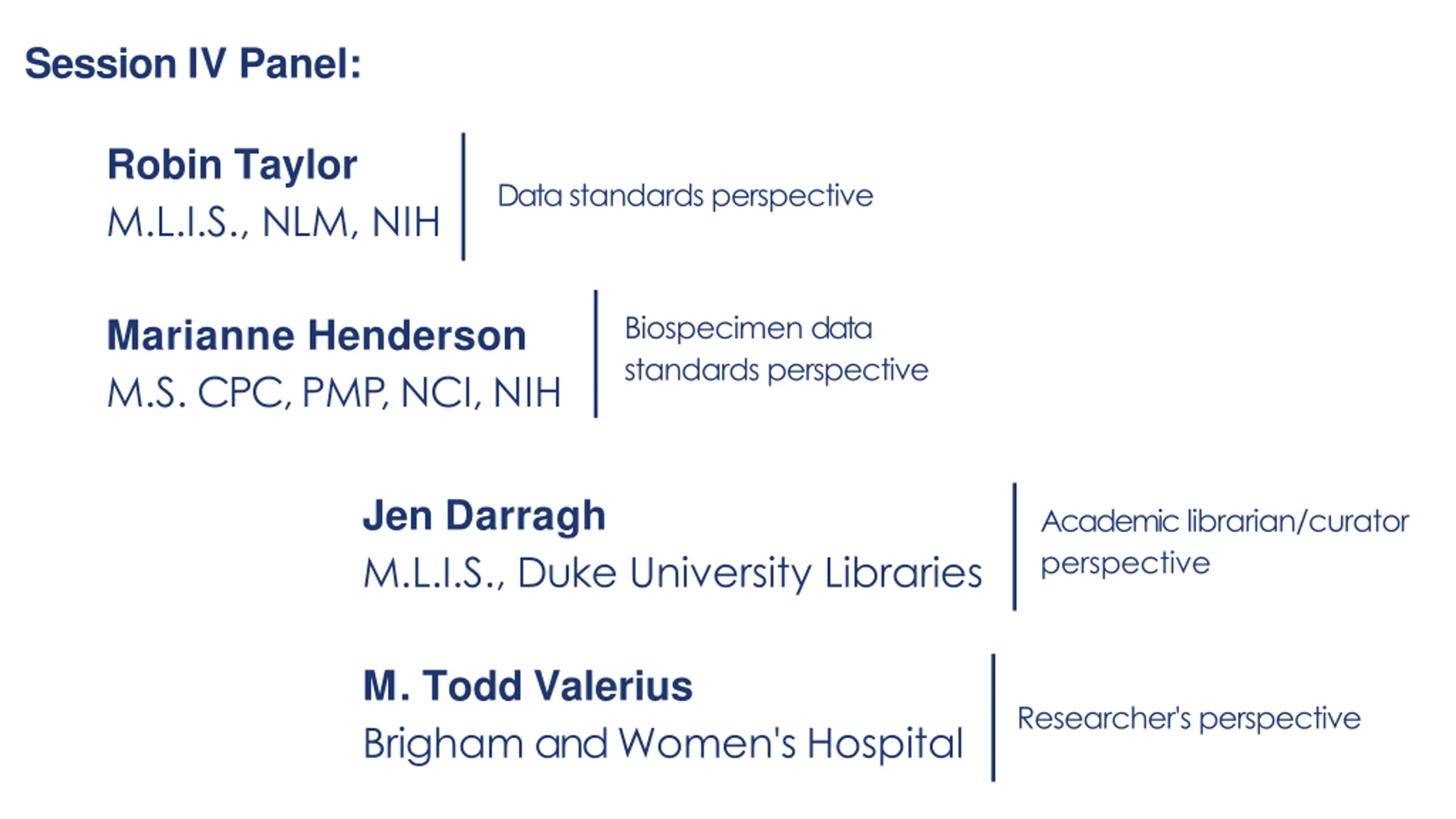Session IV Panel: Robin Taylor M.L.I.S., NLM, NIH Data standards perspective Biospecimen data standards perspective Marianne Henderson M.S. CPC, PMP, NCI, NIH Jen Darragh M.L.I.S., Duke University Libraries Academic librarian/curator perspective M. Todd Valerius Brigham and Women's Hospital Researcher's perspective