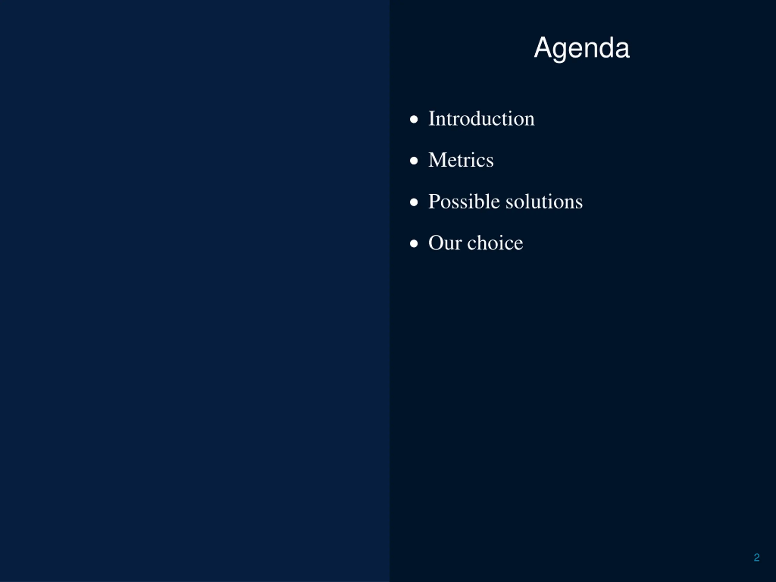 Agenda Introduction Metrics Possible solutions Our choice 2