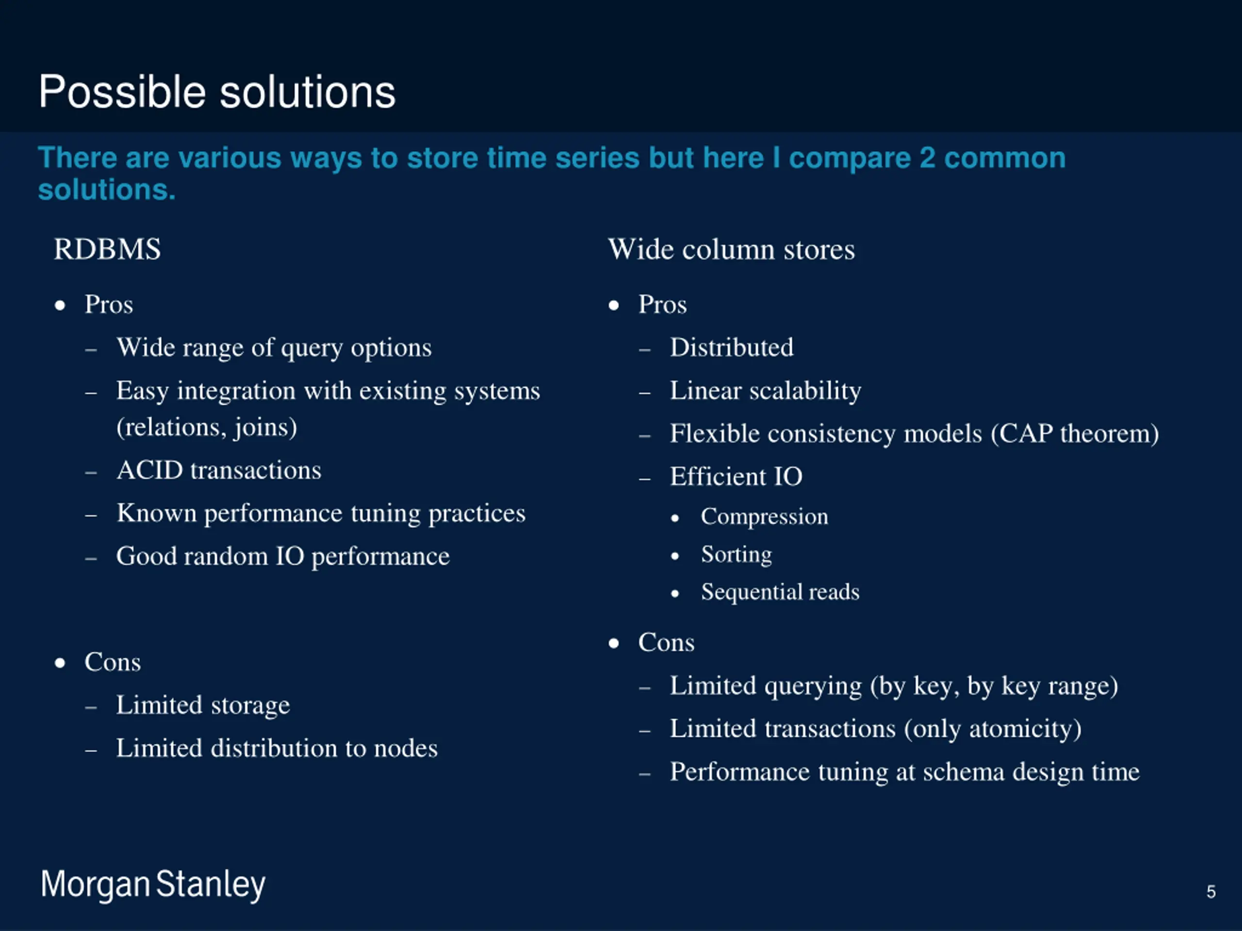 prototype template (5428278)\print library_new_final.ppt 6/5/2025 Possible solutions There are various ways to store time series but here I compare 2 common solutions. RDBMS Wide column stores Pros Pros Wide range of query options Distributed Easy integration with existing systems (relations, joins) Linear scalability Flexible consistency models (CAP theorem) ACID transactions Efficient IO Known performance tuning practices Compression Sorting Sequential reads Good random IO performance Cons Cons Limited querying (by key, by key range) Limited storage Limited transactions (only atomicity) Limited distribution to nodes Performance tuning at schema design time 5